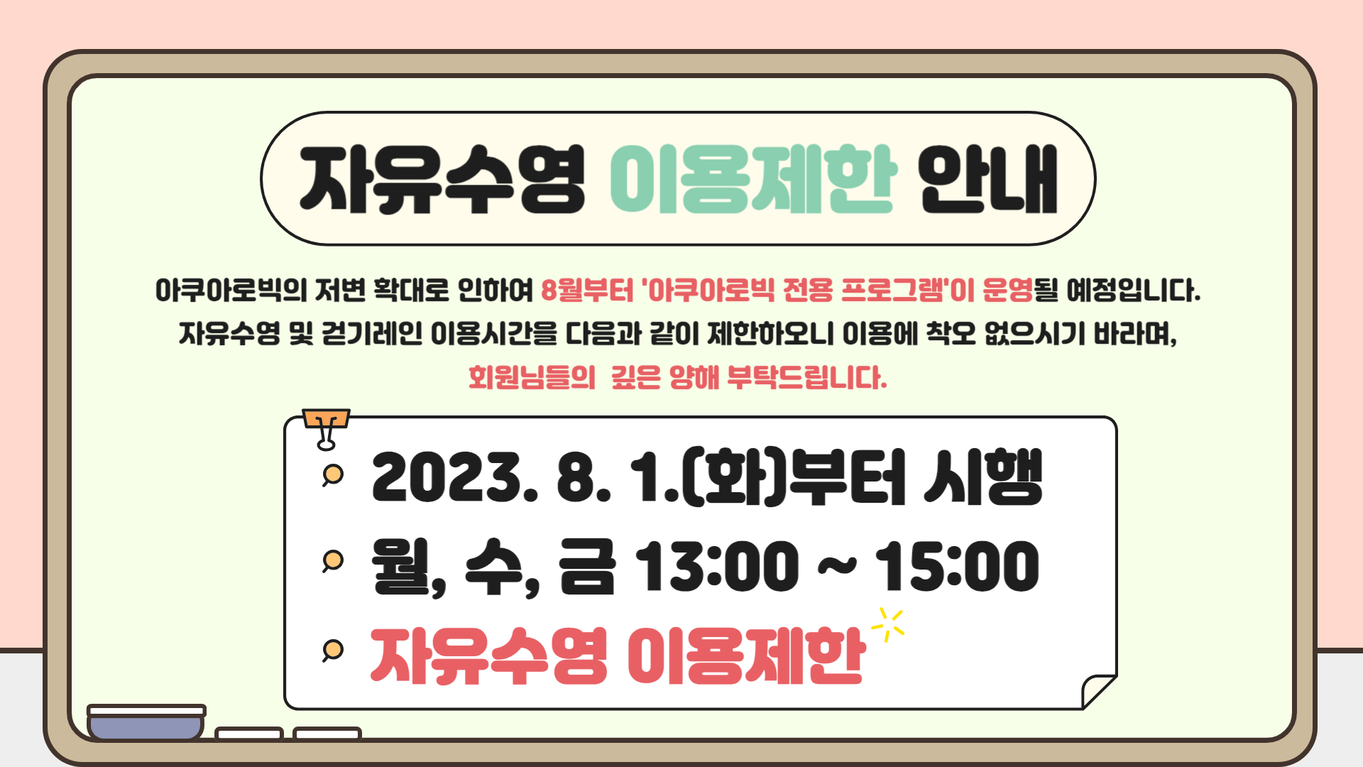 공지 아쿠아로빅 강습 확대 및 자유수영 이용시간 변경 안내 작성자 : 관리자 조회 : 1,295 등록일시 : 2023년 7월 6일 13시 11분 50초 이용시간변경안내-006 (2).png [ Size : 284.07KB, Down : 1,637 ] 미리보기 다운로드 목록보기