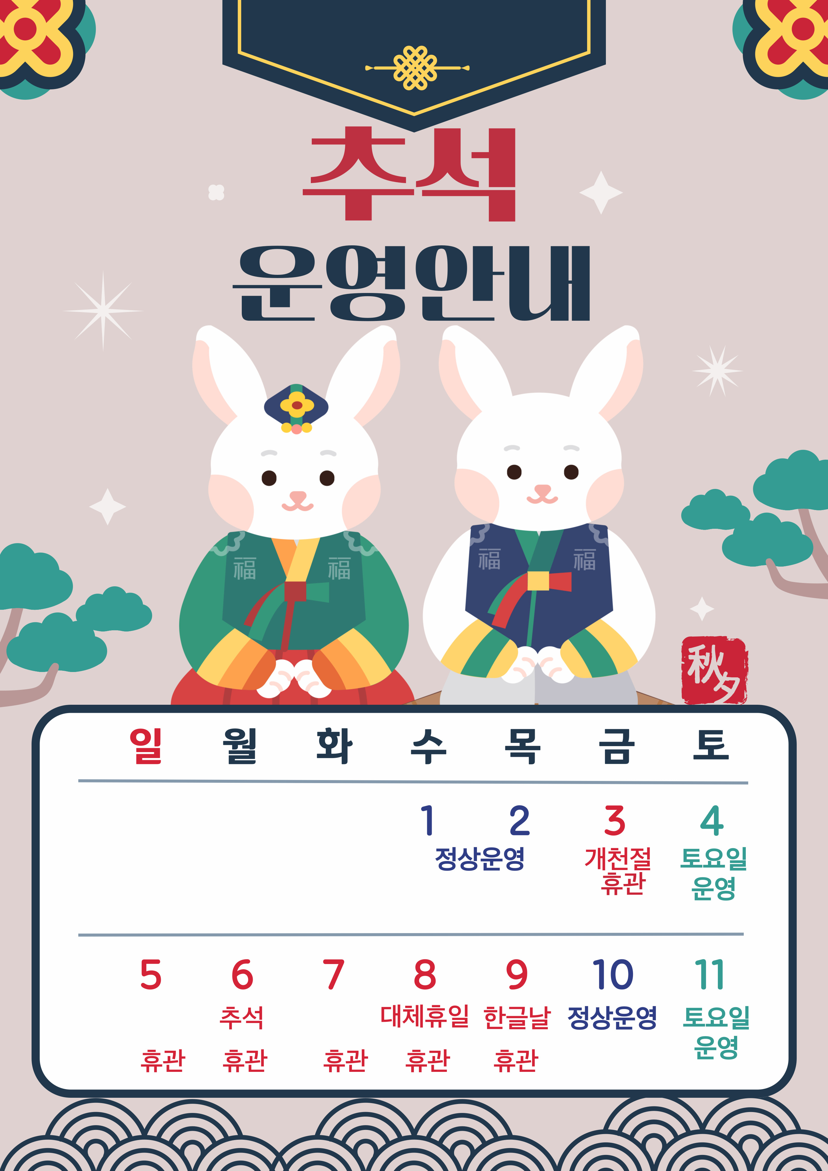 북경주체육문화센터 추석연휴 운영 안내 작성자 : 관리자 조회 : 497 등록일시 : 2025년 9월 25일 16시 3분 16초 추석운영안내-001.jpg [ Size : 940.85KB, Down : 621 ] 미리보기 다운로드 10월 1일(수), 2일(목) - 정상운영10월 3일(금) - 개천절 휴관10월 6일(월) ~ 8일(수) - 추석연휴 휴관10월 9일(목) - 한글날 휴관10월 10일(금) - 정상운영 목록보기
