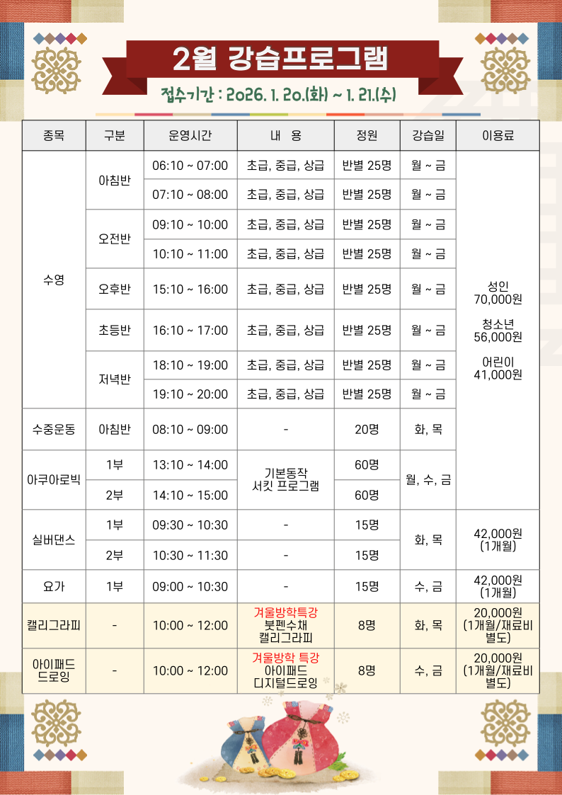 2026년 2월 강습 모집 및 등록 안내 작성자 : 관리자 조회 : 505 등록일시 : 2026년 1월 14일 15시 26분 37초 001.png [ Size : 352.06KB, Down : 732 ] 미리보기 다운로드 002.png [ Size : 364.1KB, Down : 690 ] 미리보기 다운로드 목록보기