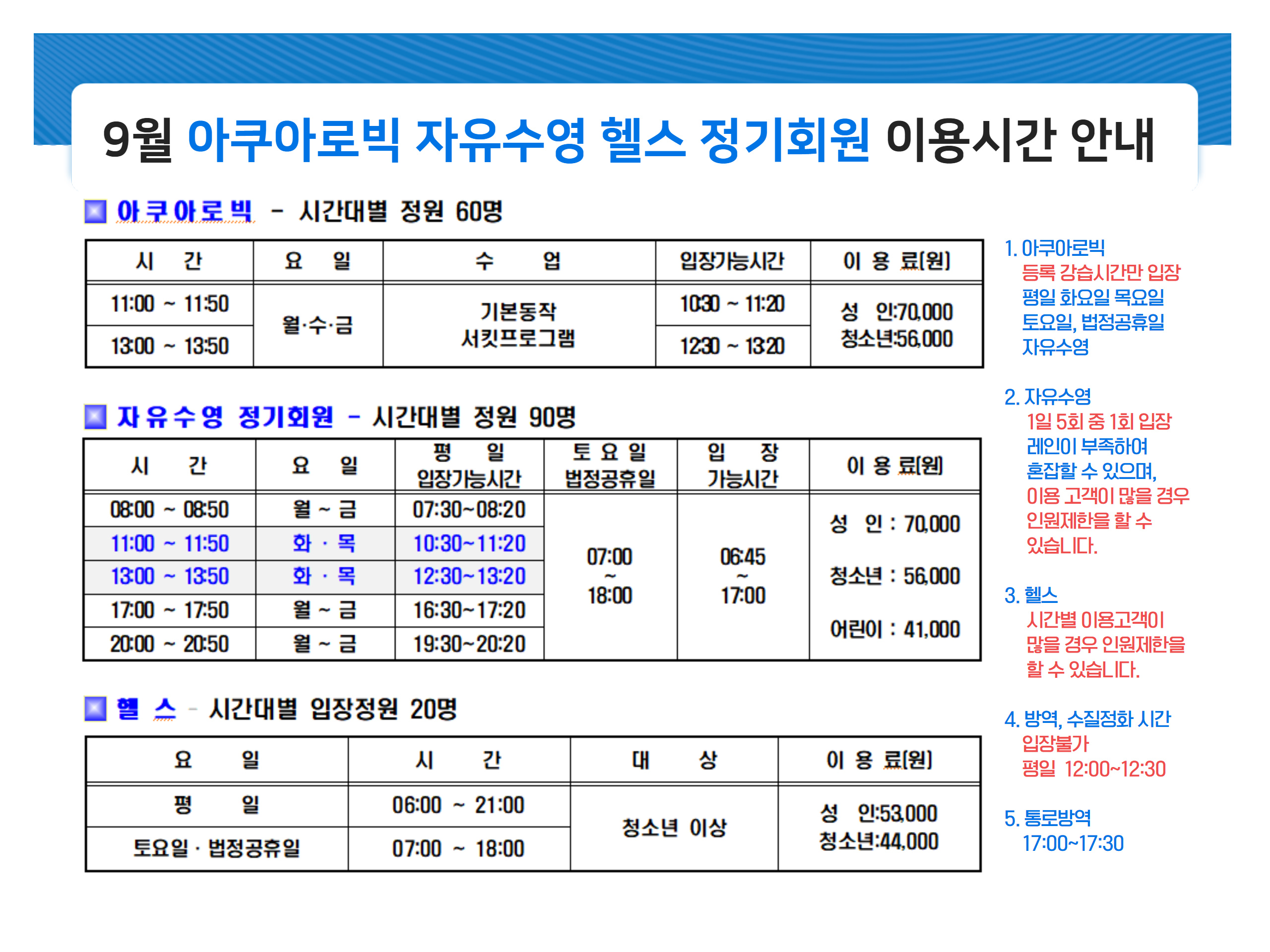* 자유수영 : 1일 5회(매회 정원 90명) 총 450명.