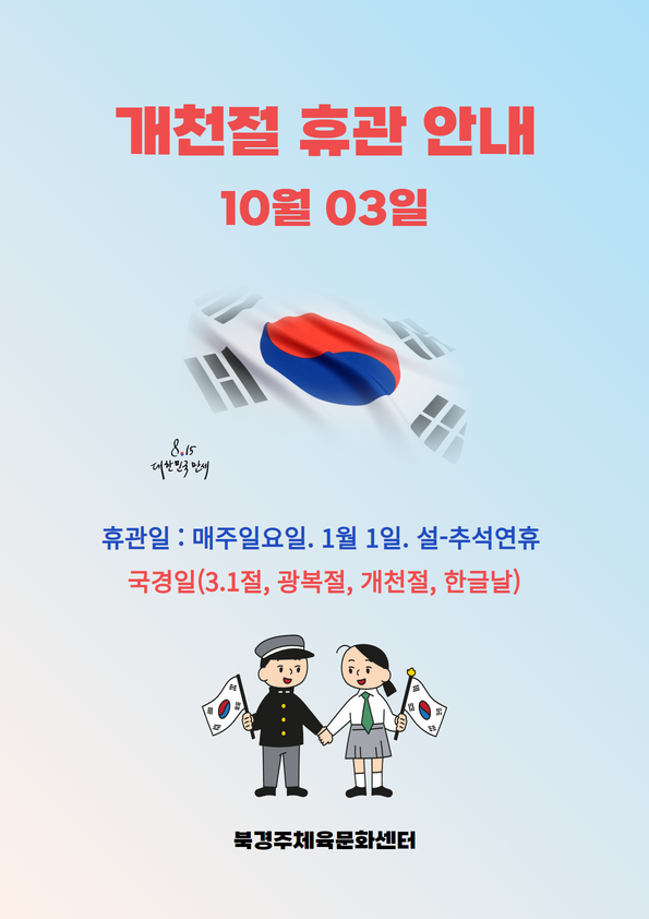 개천절 (10월 3일) 휴관안내 작성자 : 관리자 조회 : 366 등록일시 : 2022년 9월 29일 13시 43분 1초 휴관 안내 (1).png [ Size : 214.61KB, Down : 311 ] 미리보기 다운로드 목록보기