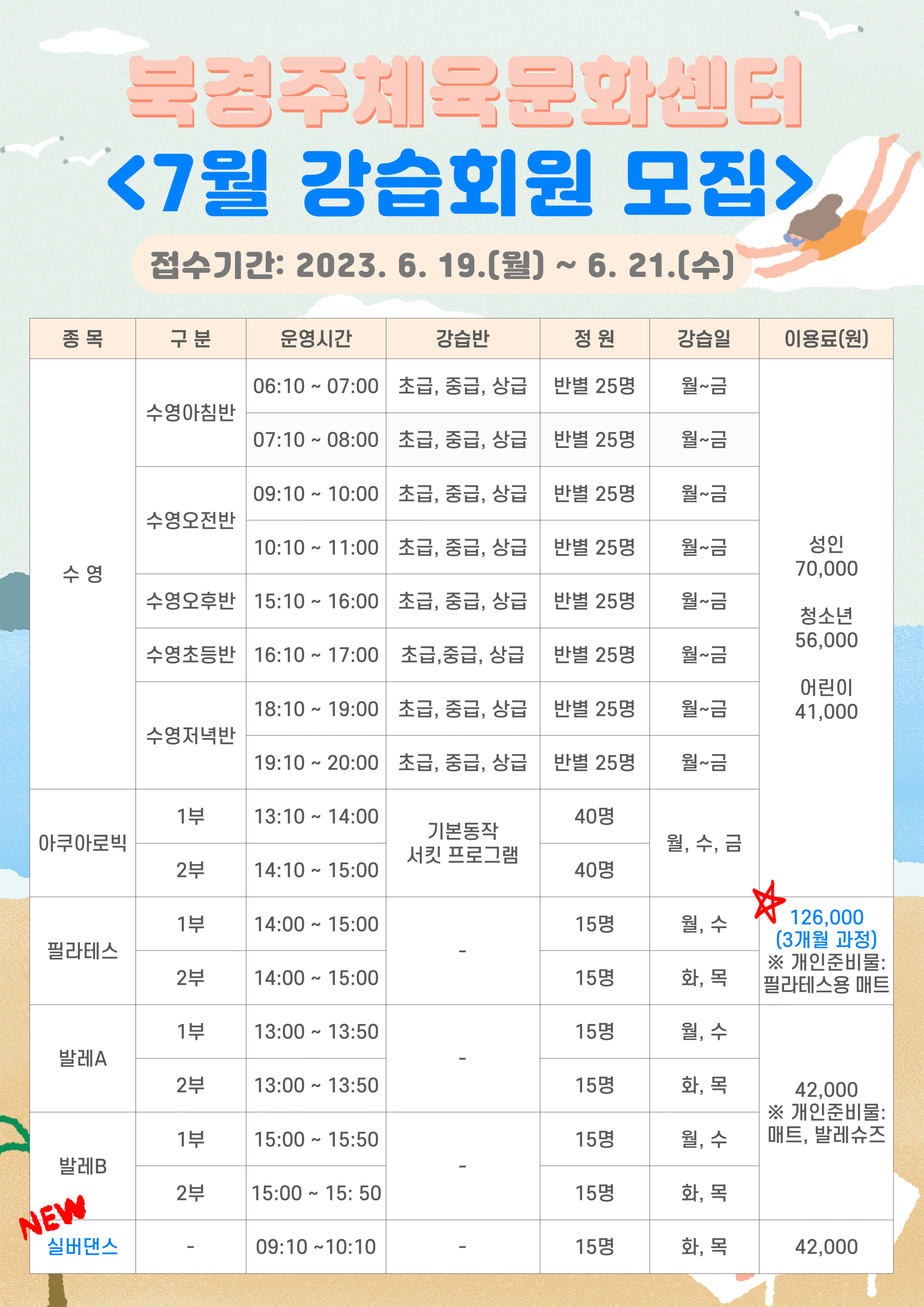 7월 정기회원 모집, 이용 안내 작성자 : 관리자 조회 : 746 등록일시 : 2023년 6월 12일 13시 22분 30초 강습회원모집(7월).png [ Size : 2.59MB, Down : 1,151 ] 미리보기 다운로드 접수및등록안내(7월).png [ Size : 2.5MB, Down : 1,104 ] 미리보기 다운로드 목록보기