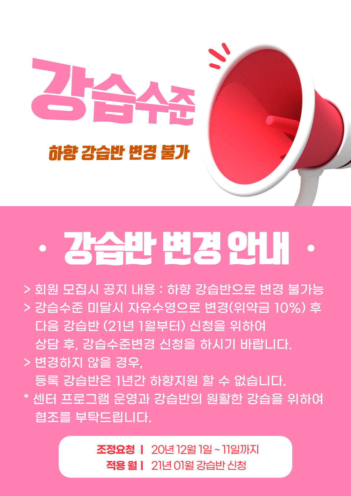 수영 수준별 강습반 이용과 변경 안내 작성자 : 관리자 조회 : 470 등록일시 : 2020년 11월 30일 9시 19분 22초 강습수준 강습반 변경 (1).png [ Size : 276.49KB, Down : 440 ] 미리보기 다운로드 수영강습수준 자기진단 바로가기 https://northgj.gyeongju.go.kr/fmcs/18 목록보기