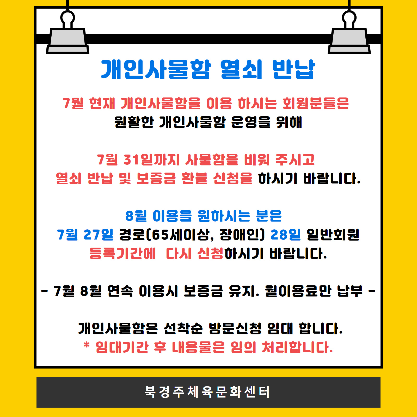개인사물함 7월 이용회원, 키반납 - 보증금 환불신청, 8월 신청 작성자 : 관리자 조회 : 502 등록일시 : 2020년 7월 25일 10시 13분 13초 개인사물함 키 반납.jpg [ Size : 588.24KB, Down : 550 ] 미리보기 다운로드 목록보기