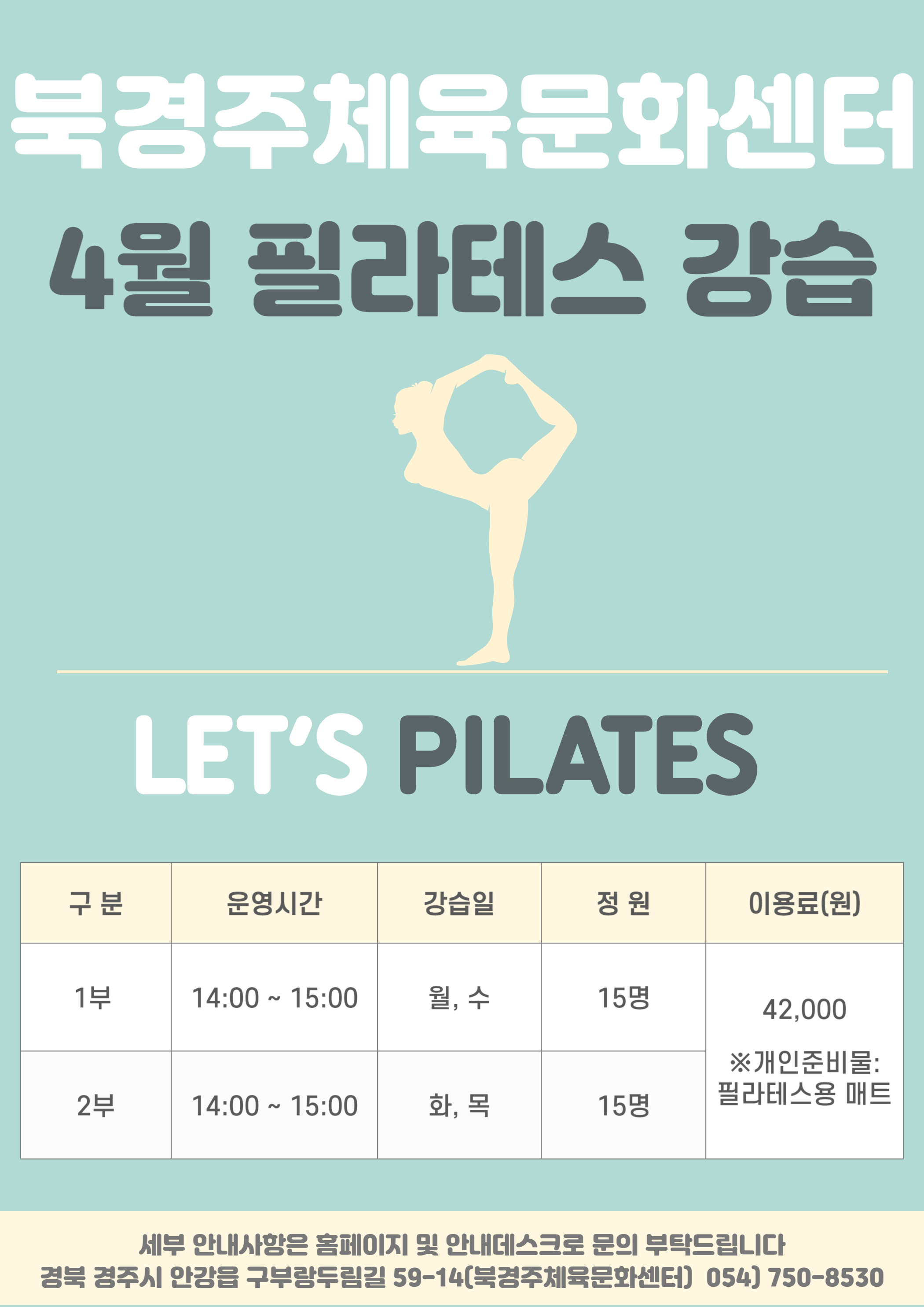 4월 필라테스 강습 안내 작성자 : 관리자 조회 : 319 등록일시 : 2023년 3월 29일 13시 16분 17초 필라테스 운영-001 (1).png [ Size : 449.48KB, Down : 339 ] 미리보기 다운로드 목록보기