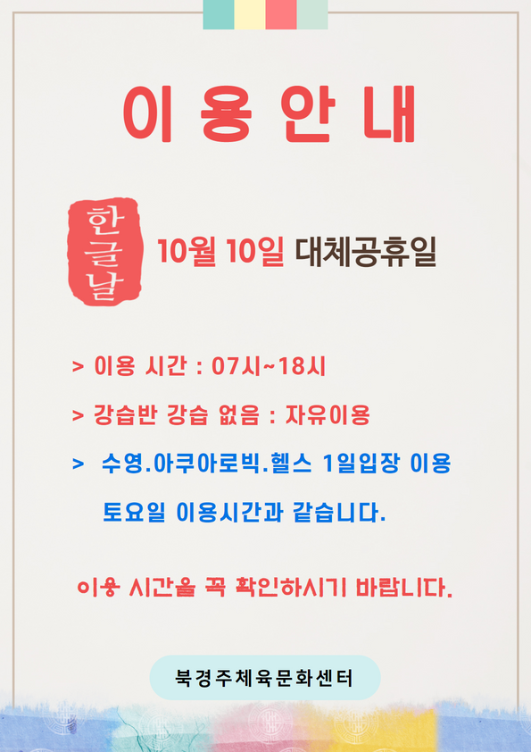 한글날, 대체공휴일(10월 10일) 이용 안내 작성자 : 관리자 조회 : 390 등록일시 : 2022년 10월 4일 10시 16분 47초 10월 10일 대체공휴일.png [ Size : 422.11KB, Down : 427 ] 미리보기 다운로드 목록보기