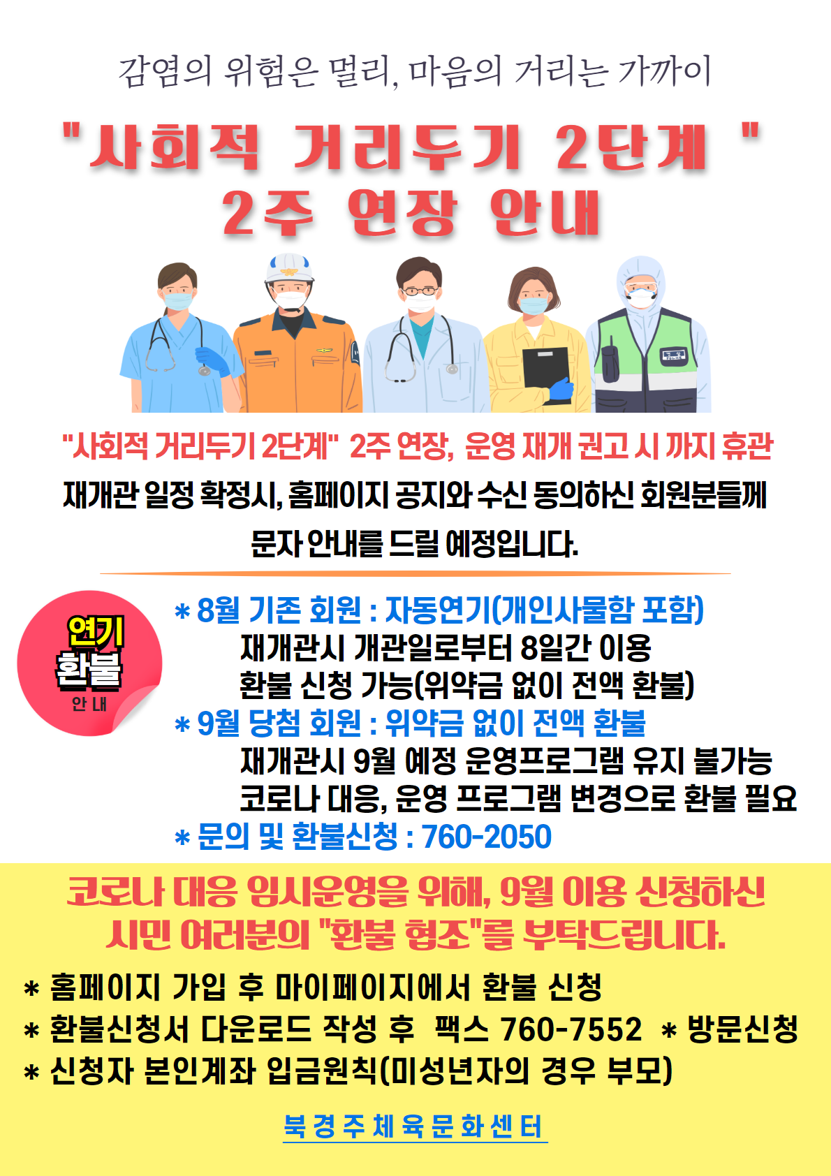 임시휴관 2주 연장 안내 (사회적 거리두기 2단계 ) 작성자 : 관리자 조회 : 617 등록일시 : 2020년 9월 5일 9시 25분 38초 [복사본] 임시휴관 연장 공지.png [ Size : 318.73KB, Down : 591 ] 미리보기 다운로드 목록보기