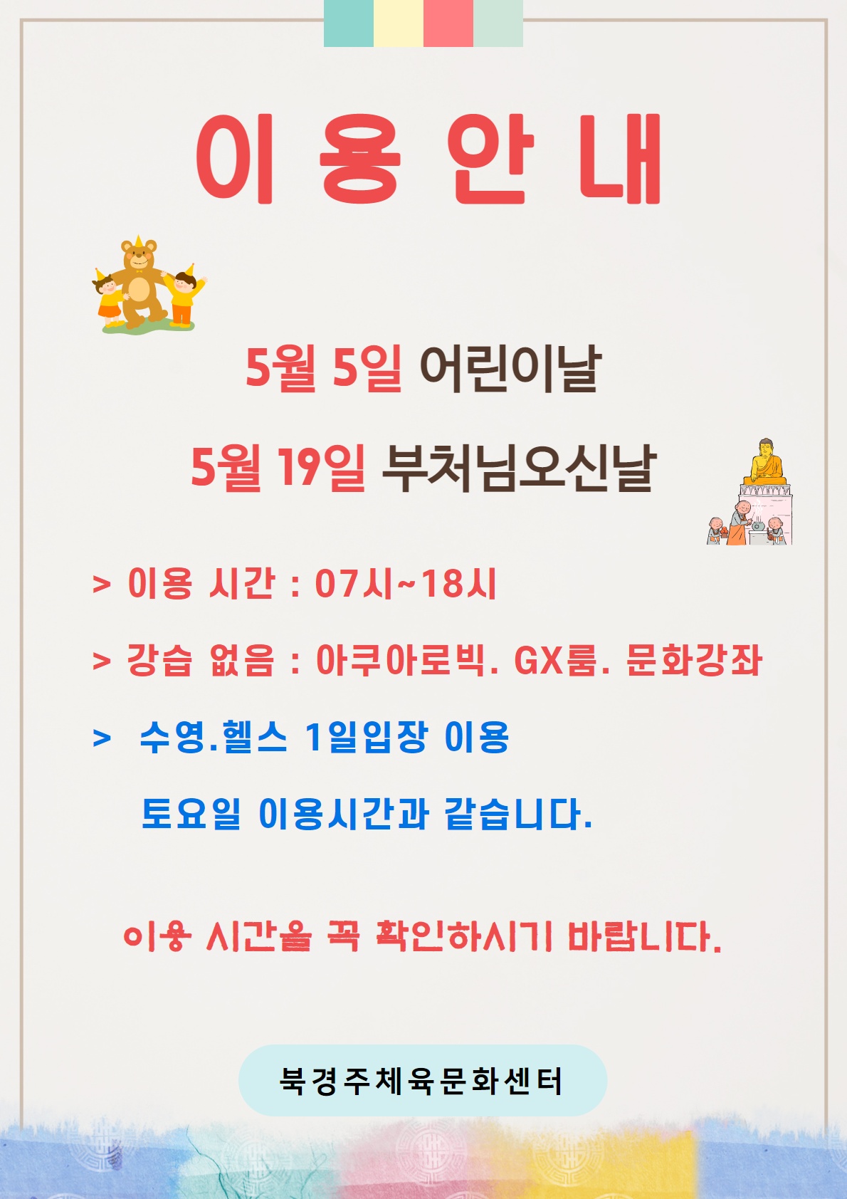 5월 어린이날, 부처님오신날 이용안내 작성자 : 관리자 조회 : 421 등록일시 : 2021년 5월 3일 9시 18분 13초 5월 어린이날.부처님오신날이용안내.jpg [ Size : 311.38KB, Down : 402 ] 미리보기 다운로드 목록보기