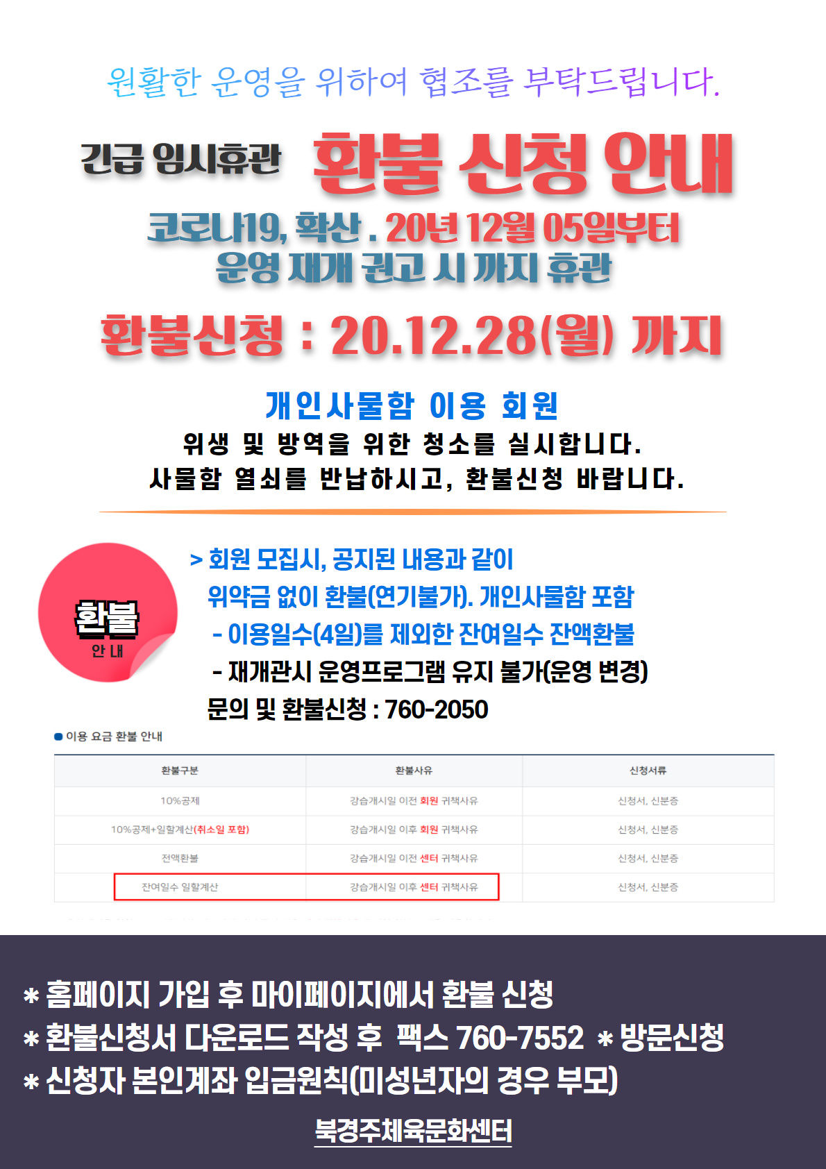 긴급 임시휴관 환불신청(신청서 첨부) 안내 작성자 : 관리자 조회 : 777 등록일시 : 2020년 12월 10일 16시 5분 36초 12월 긴급임시휴관 환불.jpg [ Size : 601.46KB, Down : 851 ] 미리보기 다운로드 목록보기