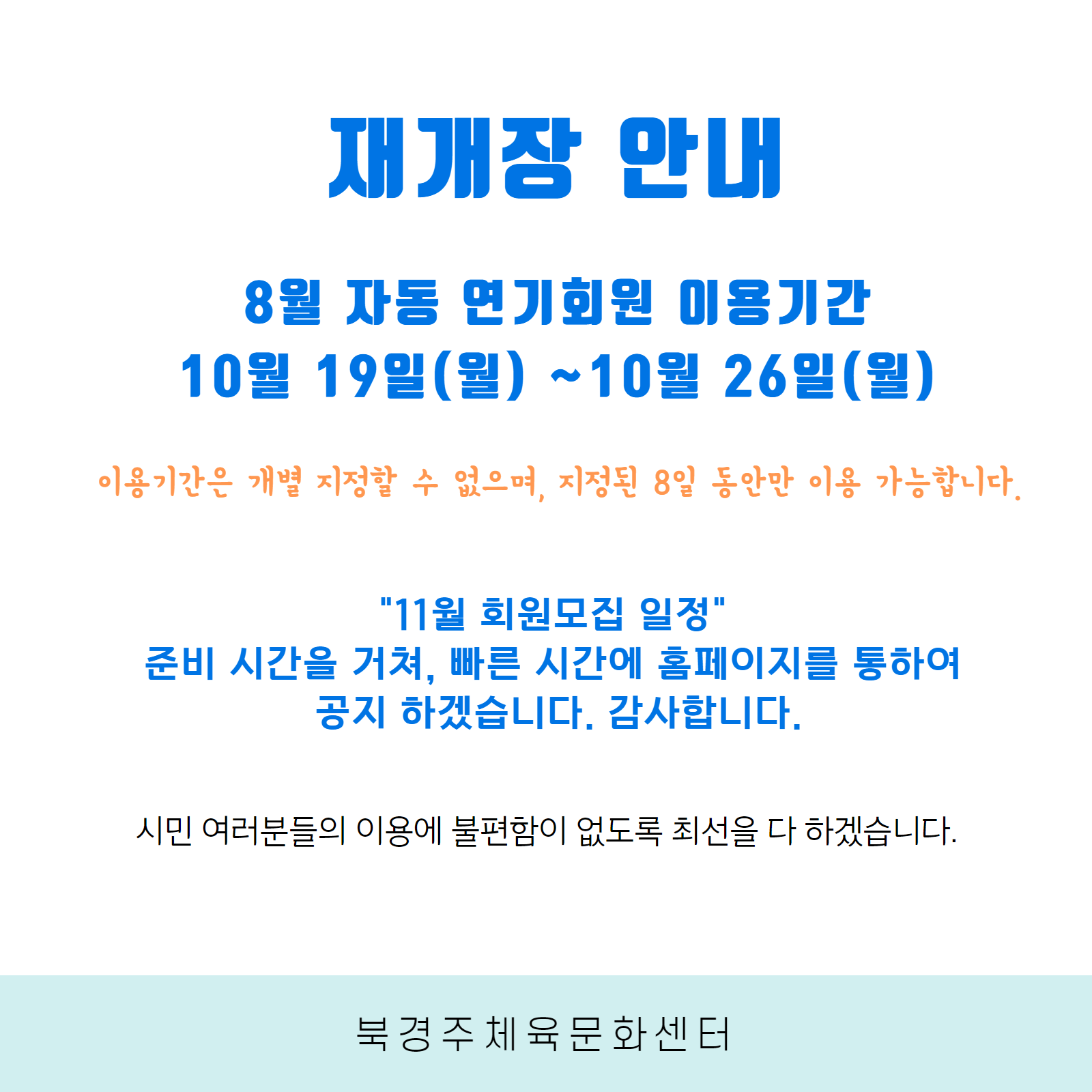 재개장 안내 및 8월 자동연기회원 이용일정 안내 작성자 : 관리자 조회 : 532 등록일시 : 2020년 10월 12일 12시 11분 33초 재개장안내.png [ Size : 98.67KB, Down : 571 ] 미리보기 다운로드 목록보기