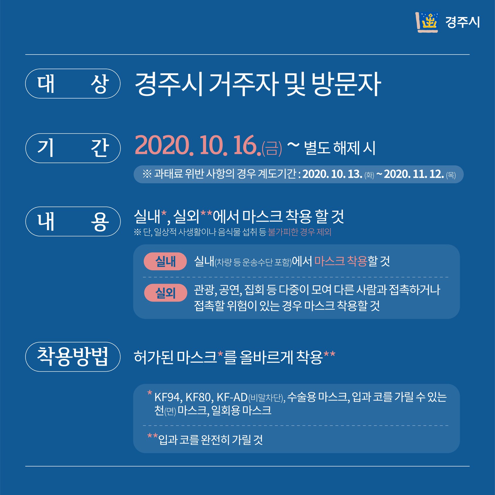 올바른 마스크 착용, 선택이 아닌 필수입니다! 마스크 착용 의무화 행정명령 변경 고시 작성자 : 관리자 조회 : 349 등록일시 : 2020년 10월 21일 8시 59분 45초 마스크1.jpg [ Size : 202.24KB, Down : 301 ] 미리보기 다운로드 마스크2.jpg [ Size : 221.23KB, Down : 220 ] 미리보기 다운로드 목록보기