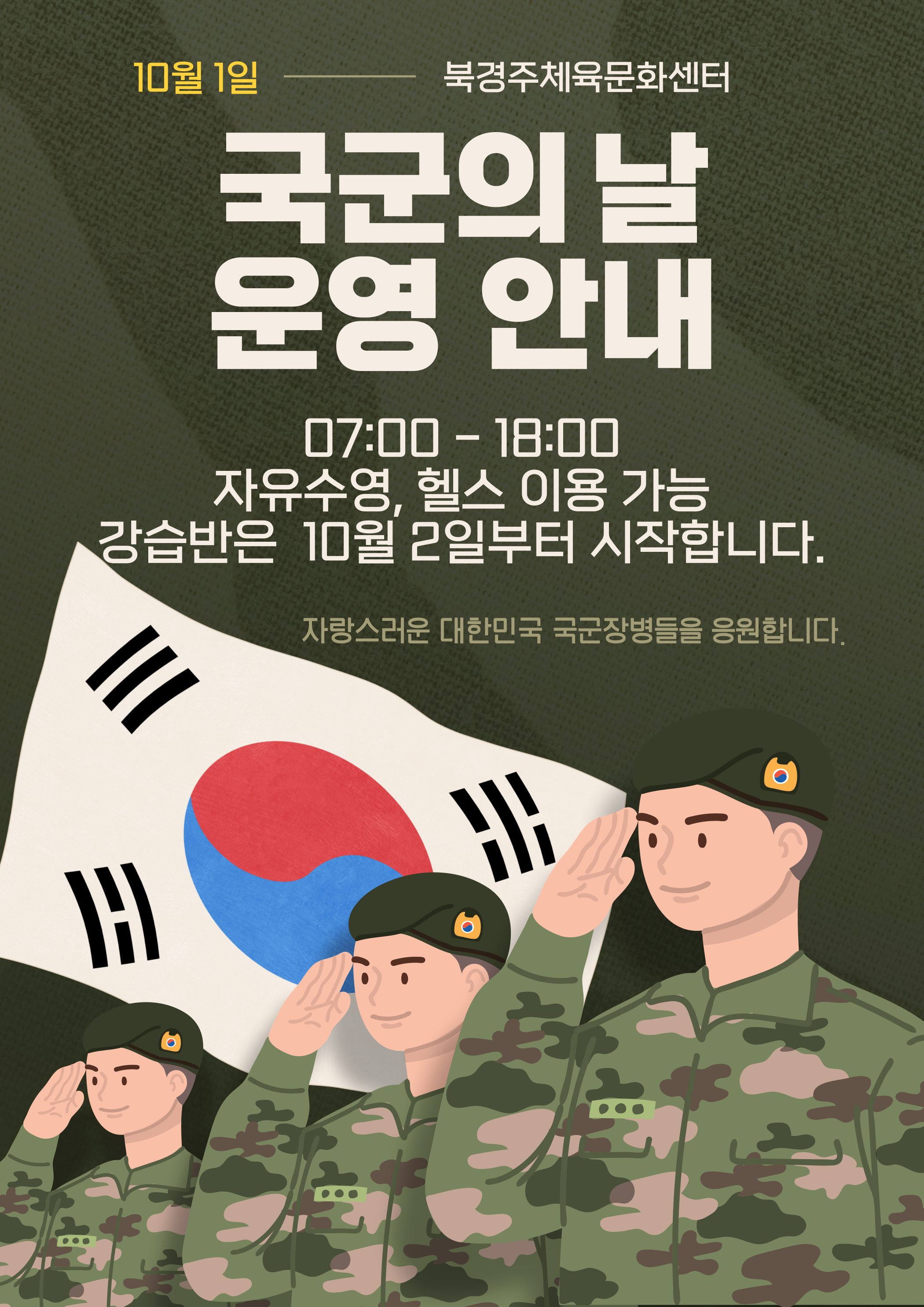 10월1일 국군의날 운영 안내 작성자 : 관리자 조회 : 472 등록일시 : 2024년 9월 23일 17시 22분 1초 북경주-국군의날-001.png [ Size : 4.37MB, Down : 633 ] 미리보기 다운로드 목록보기
