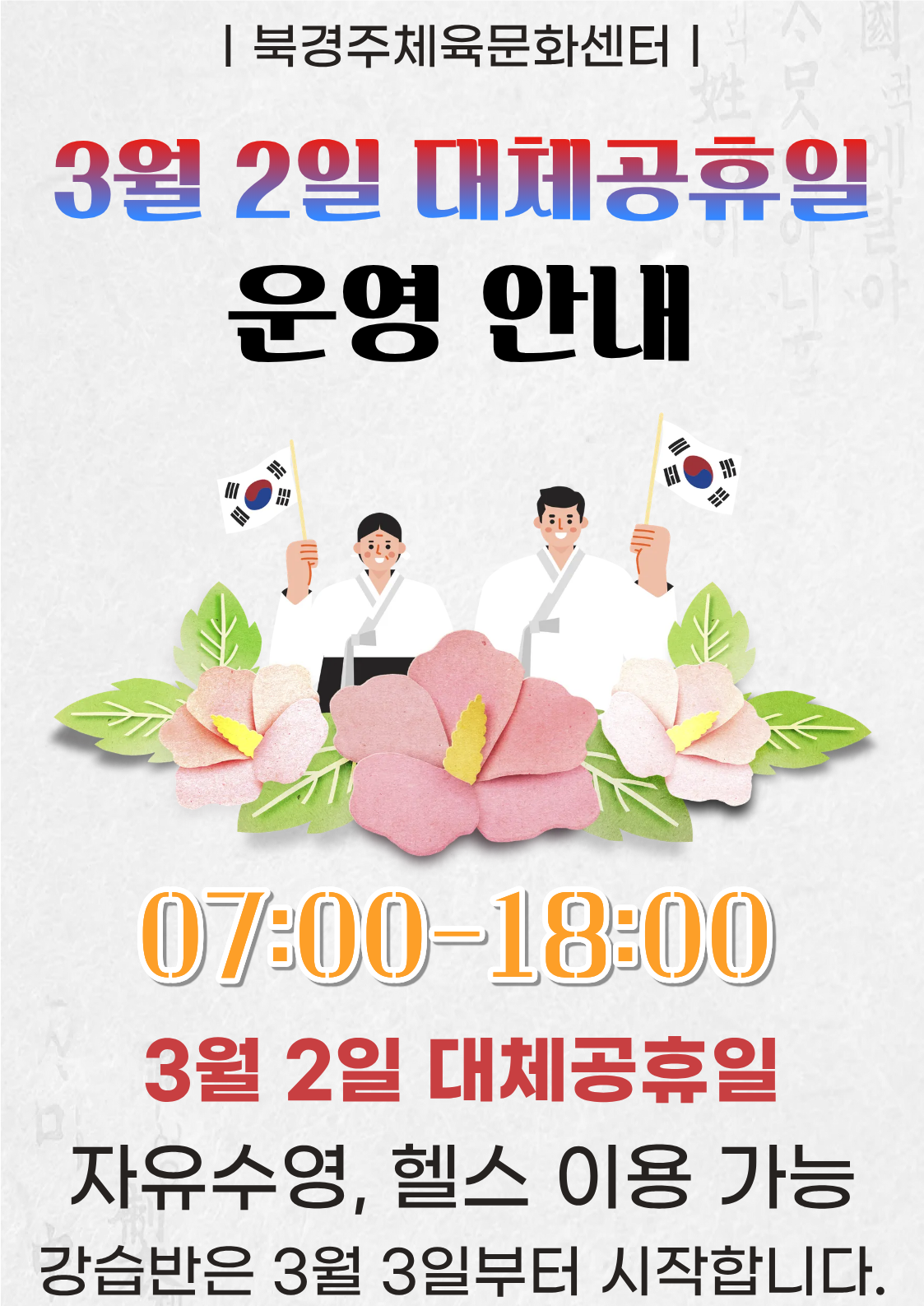 북경주체육문화센터 3월 공휴일 운영 안내 작성자 : 관리자 조회 : 166 등록일시 : 2026년 2월 26일 16시 17분 19초 북경주- 복사본.png [ Size : 1.29MB, Down : 173 ] 미리보기 다운로드 목록보기