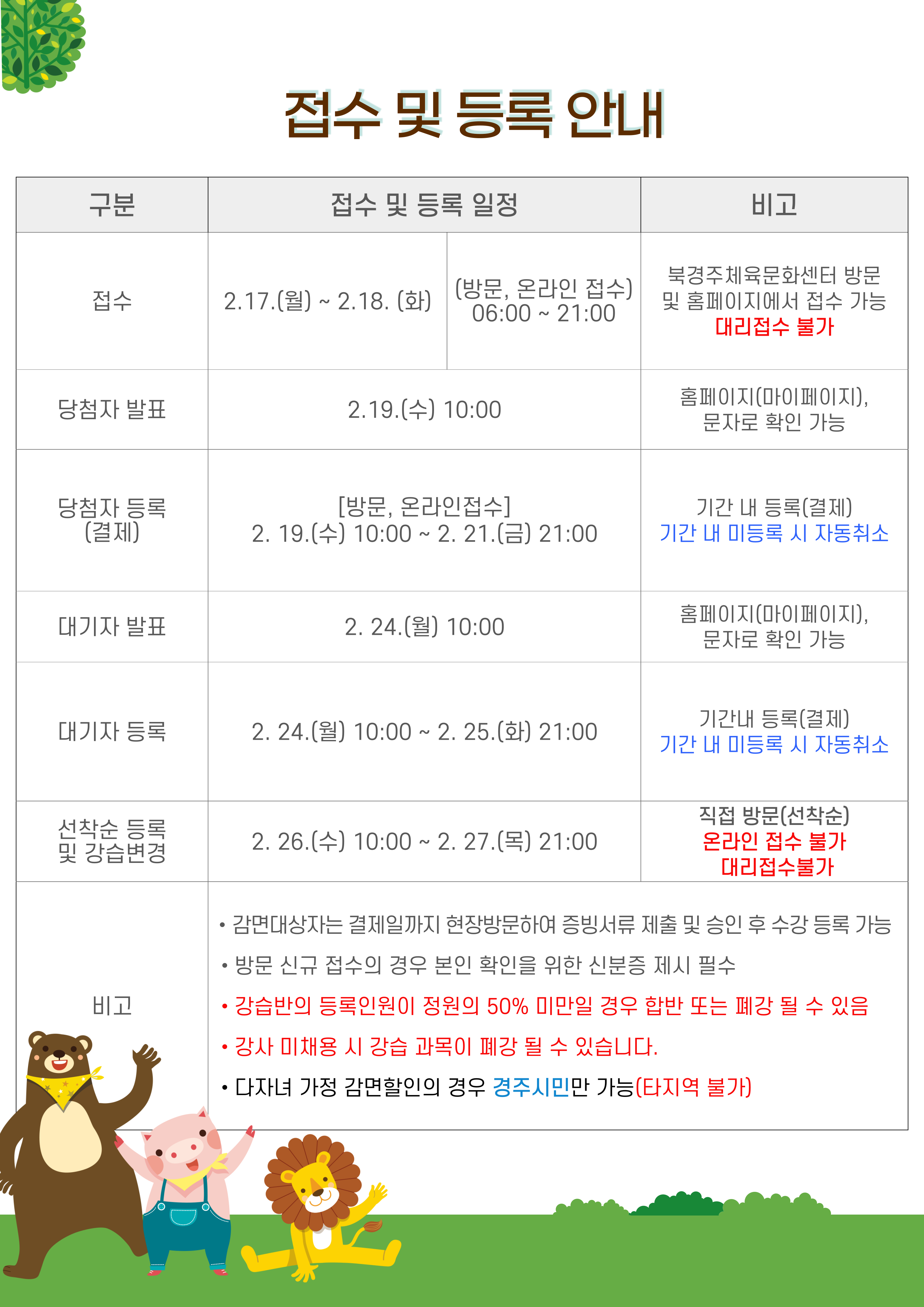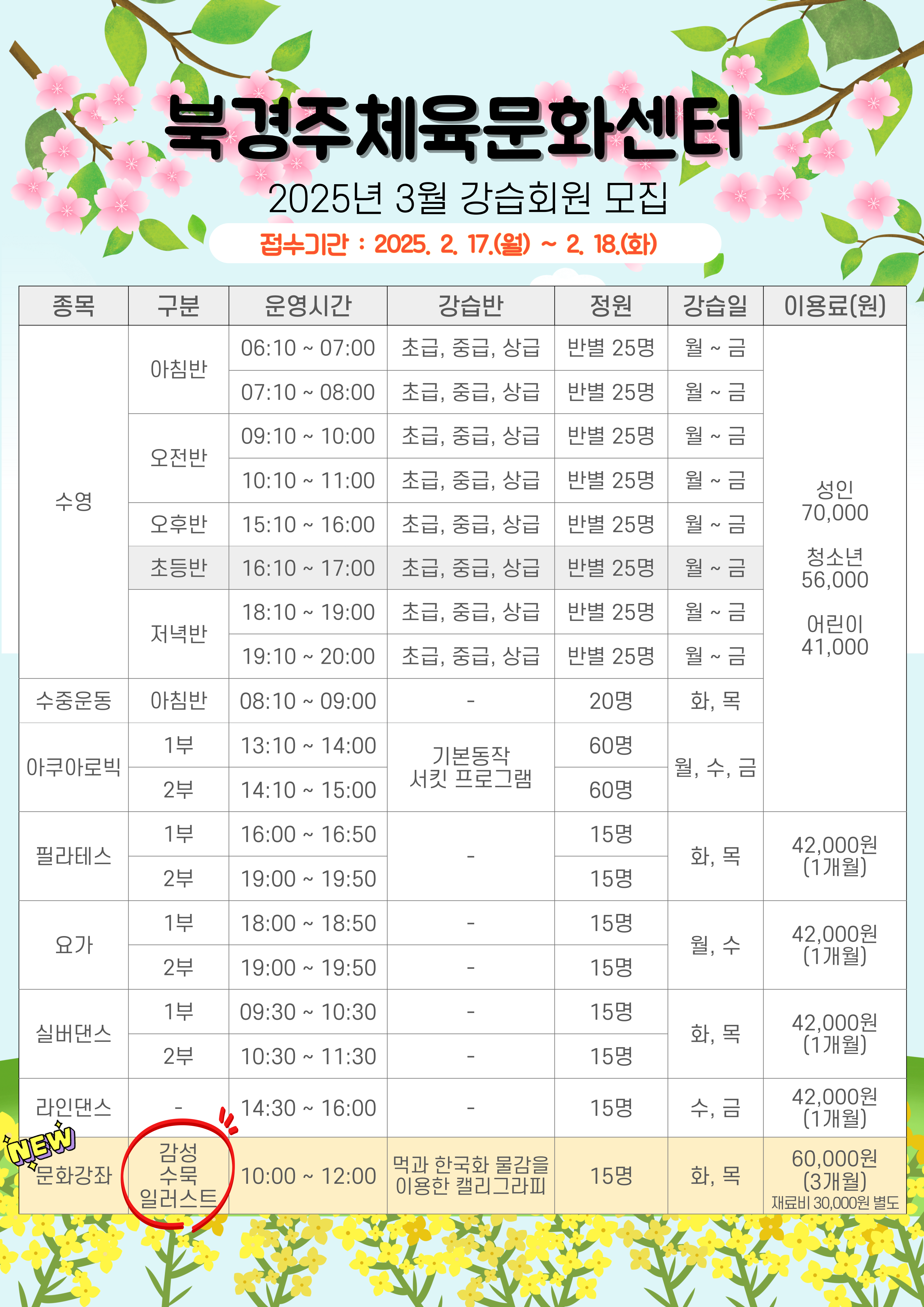 2025년 3월 강습 모집 & 접수 및 등록 안내 작성자 : 관리자 조회 : 599 등록일시 : 2025년 2월 12일 10시 52분 55초 001.png [ Size : 2.24MB, Down : 974 ] 미리보기 다운로드 002.png [ Size : 811.91KB, Down : 894 ] 미리보기 다운로드 목록보기