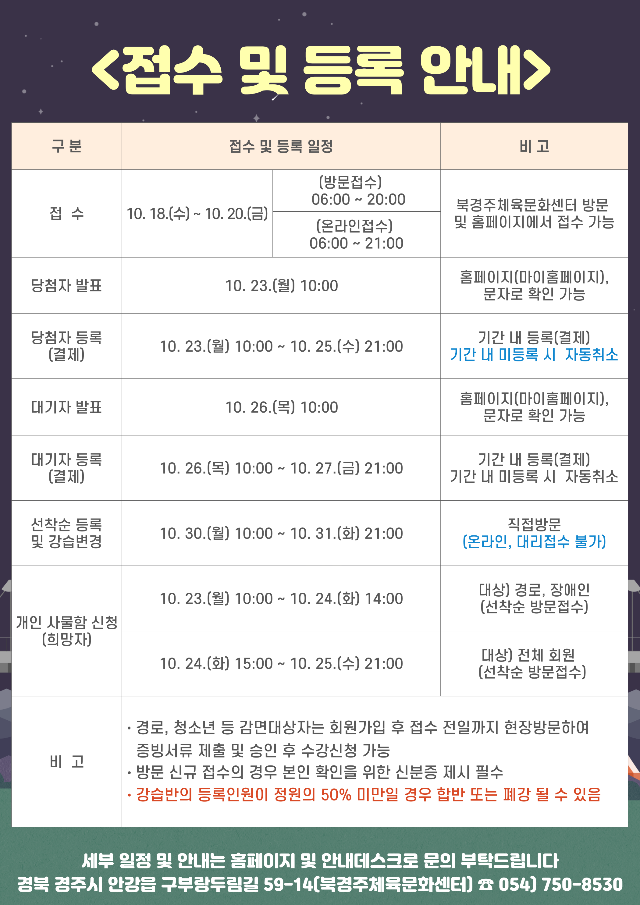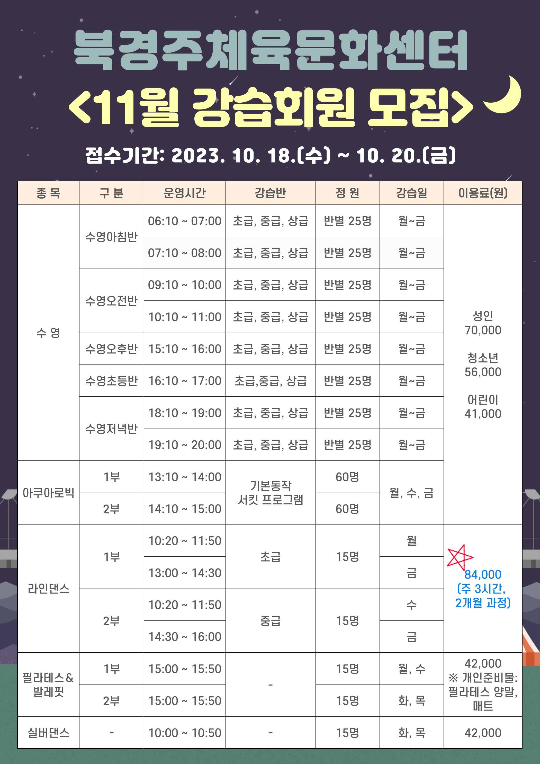 11월 정기회원 모집, 이용 안내 작성자 : 관리자 조회 : 755 등록일시 : 2023년 10월 17일 16시 19분 51초 접수및등록안내(11월).png [ Size : 1.02MB, Down : 1,191 ] 미리보기 다운로드 강습회원 모집(11월).png [ Size : 707.82KB, Down : 1,154 ] 미리보기 다운로드 목록보기