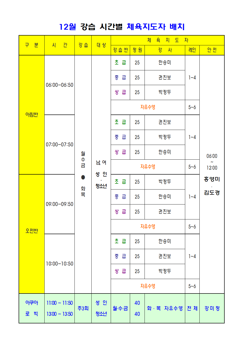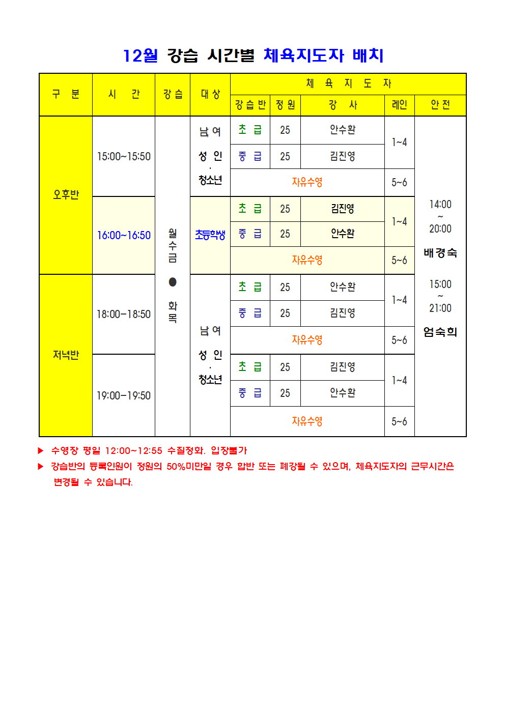 12월, 수영 강습반 체육지도자 배치 안내 작성자 : 관리자 조회 : 762 등록일시 : 2022년 11월 25일 9시 56분 12초 image001.png [ Size : 58.07KB, Down : 915 ] 미리보기 다운로드 image002.png [ Size : 57.26KB, Down : 957 ] 미리보기 다운로드 목록보기