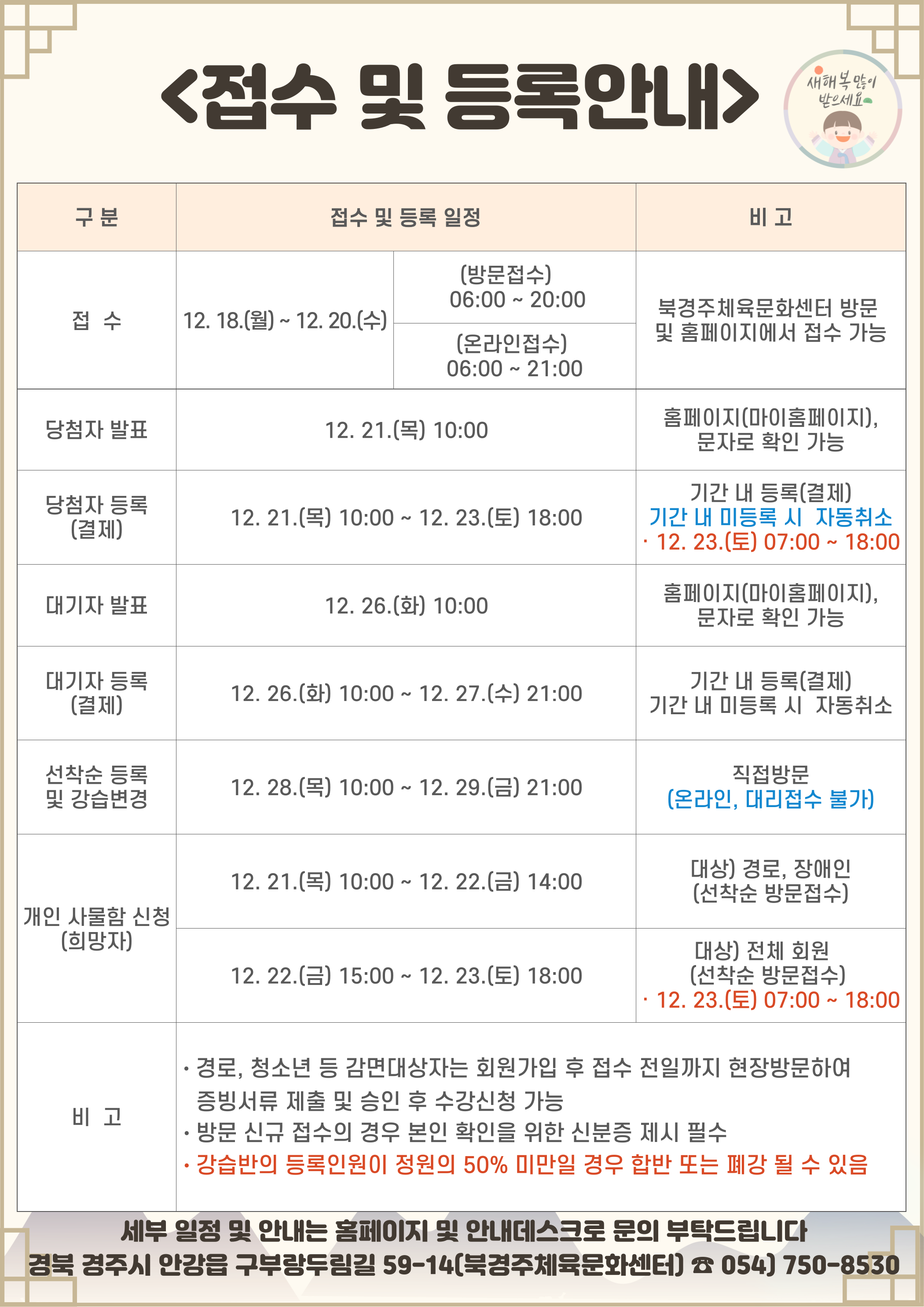 1월 정기회원 모집, 이용 안내 작성자 : 관리자 조회 : 518 등록일시 : 2023년 12월 13일 17시 34분 30초 강습회원모집(1월).png [ Size : 623.36KB, Down : 659 ] 미리보기 다운로드 접수및등록안내(1월).png [ Size : 616.39KB, Down : 638 ] 미리보기 다운로드 목록보기