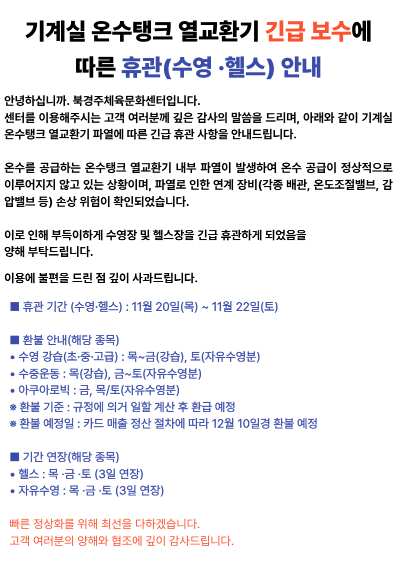 ★★★★긴급 휴관 안내★★★★ 작성자 : 관리자 조회 : 340 등록일시 : 2025년 11월 19일 16시 6분 34초 긴급휴관 (2).png [ Size : 136.86KB, Down : 385 ] 미리보기 다운로드 목록보기