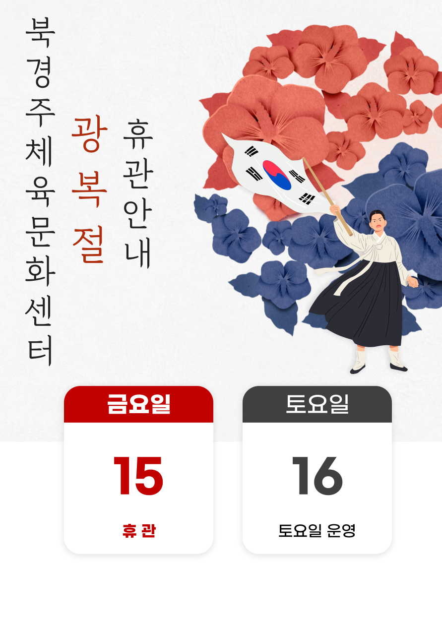 북경주체육문화센터 8.15 (광복절) 휴관안내 작성자 : 관리자 조회 : 181 등록일시 : 2025년 8월 6일 16시 8분 42초 광복절-휴관-안내-001.png [ Size : 871.65KB, Down : 199 ] 미리보기 다운로드 목록보기