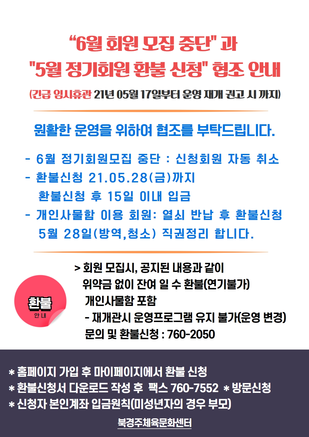 “6월 회원 모집 중단" 과 "5월 정기회원 환불 신청" 협조 안내 작성자 : 관리자 조회 : 747 등록일시 : 2021년 5월 17일 13시 10분 6초 5월 17일 긴급 임시휴관.jpg [ Size : 647.6KB, Down : 556 ] 미리보기 다운로드 목록보기