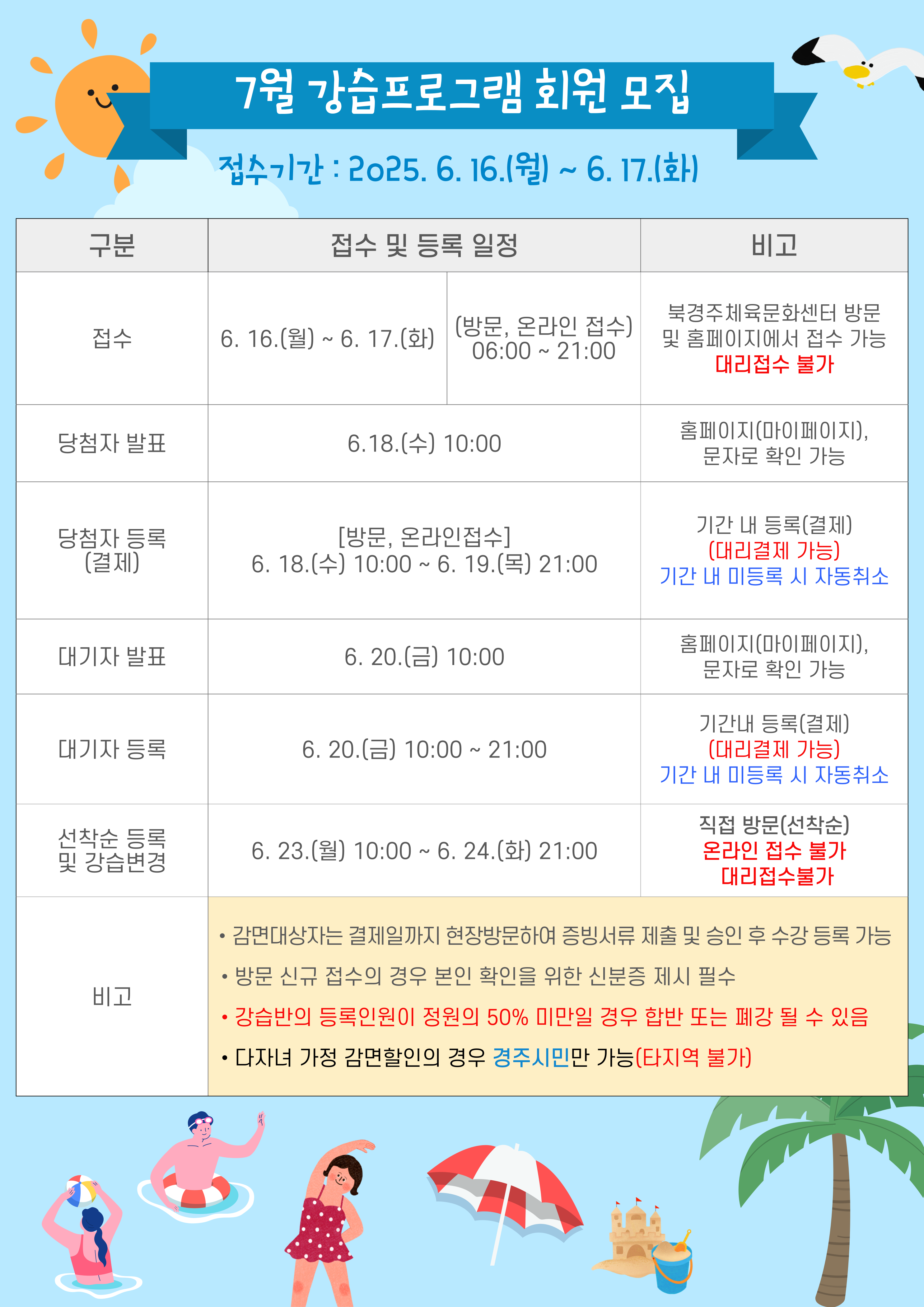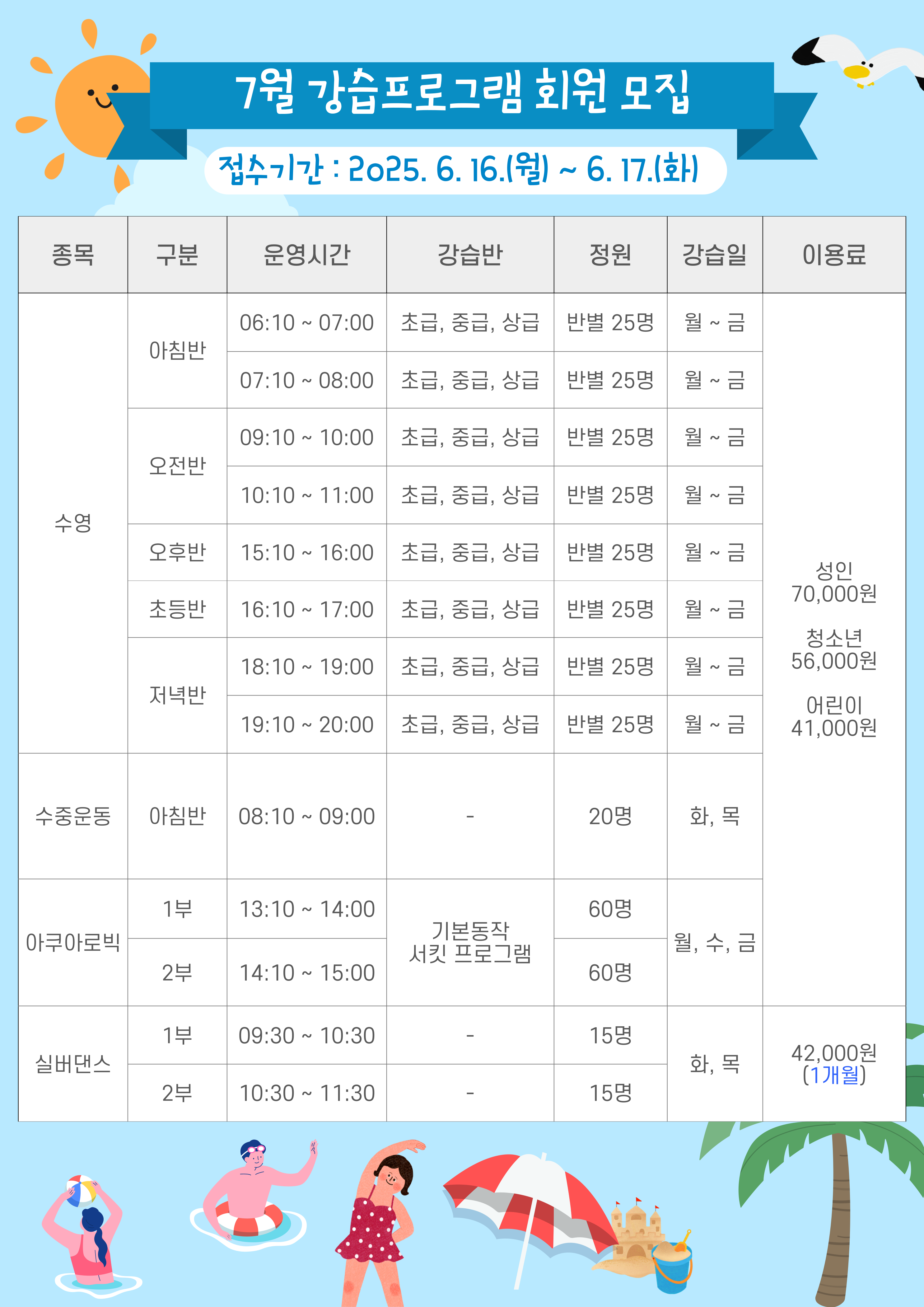 2025년 7월 강습 모집 및 등록 안내 작성자 : 관리자 조회 : 708 등록일시 : 2025년 6월 12일 10시 49분 51초 회원모집 안내문(7월)_page0_image.jpg [ Size : 1009.26KB, Down : 1,060 ] 미리보기 다운로드 회원모집 안내문(7월)_page1_image.jpg [ Size : 1.02MB, Down : 1,042 ] 미리보기 다운로드 목록보기