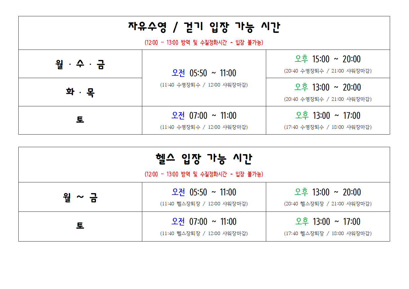 11:40에 수영장퇴수, 헬스장퇴장 하셔야 하며, 12:00에는 샤워장마감을 하오니 센터에서 퇴장 해주셔야 합니다.