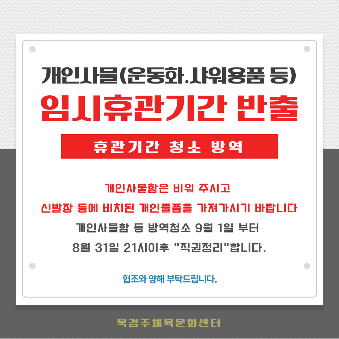 휴관기간 개인사물(운동화.샤워용품등) 반출 안내 작성자 : 관리자 조회 : 419 등록일시 : 2022년 8월 22일 10시 12분 39초 임시휴관기간 반출.png [ Size : 183.78KB, Down : 378 ] 미리보기 다운로드 목록보기