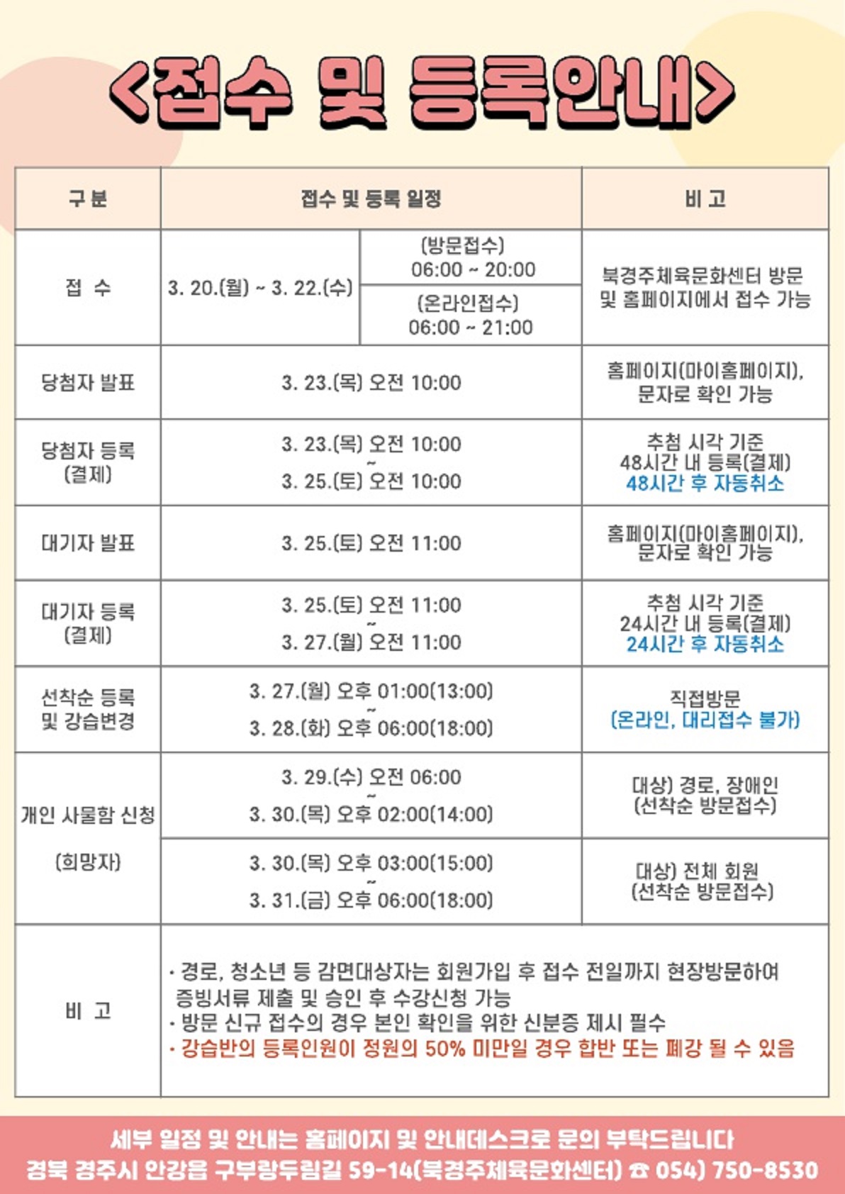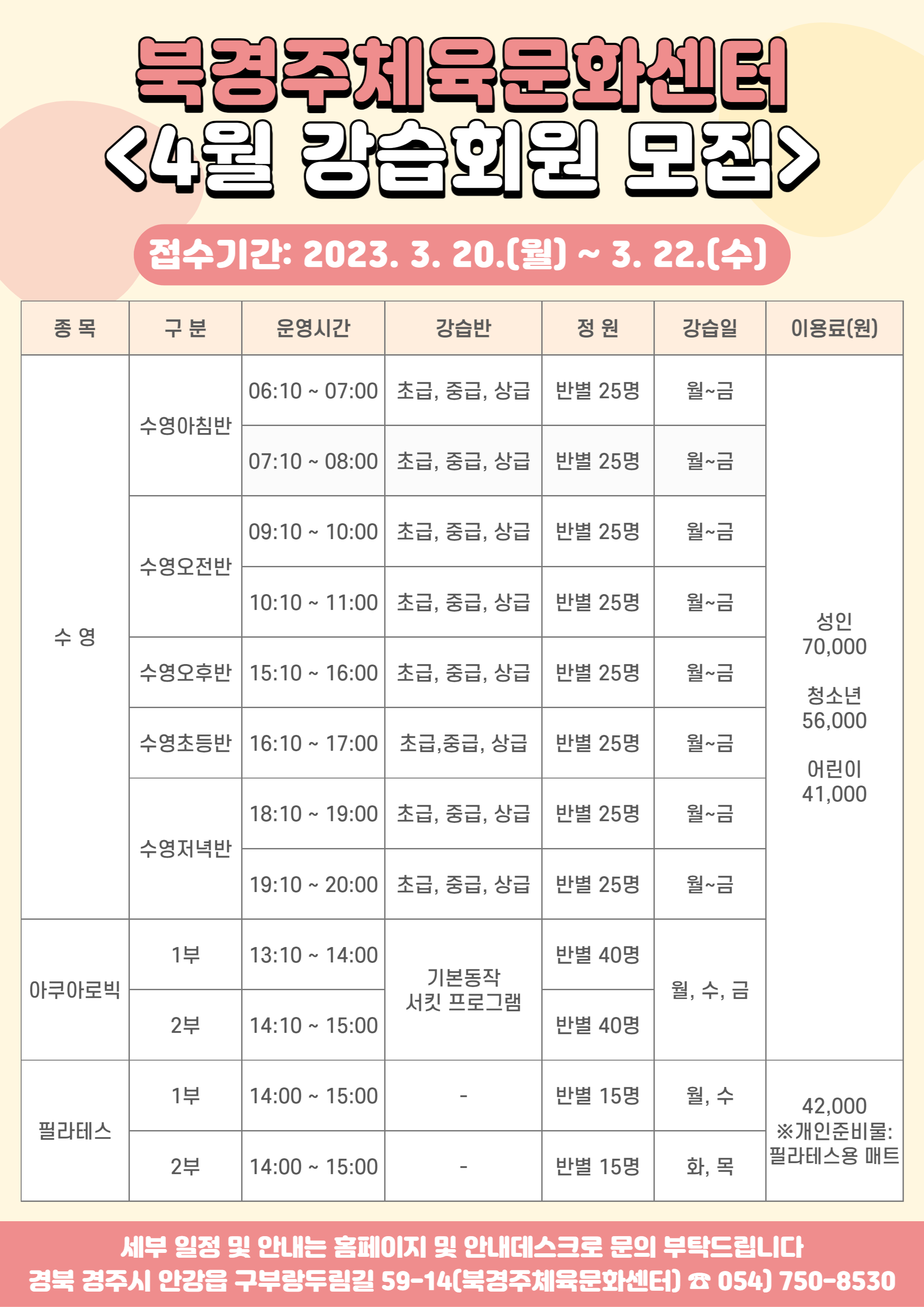 4월 정기회원 모집, 이용 안내 작성자 : 관리자 조회 : 675 등록일시 : 2023년 3월 13일 15시 42분 50초 강습회원모집(4월).png [ Size : 797.86KB, Down : 1,030 ] 미리보기 다운로드 접수및등록안내(4월).jpg [ Size : 366.19KB, Down : 999 ] 미리보기 다운로드 목록보기