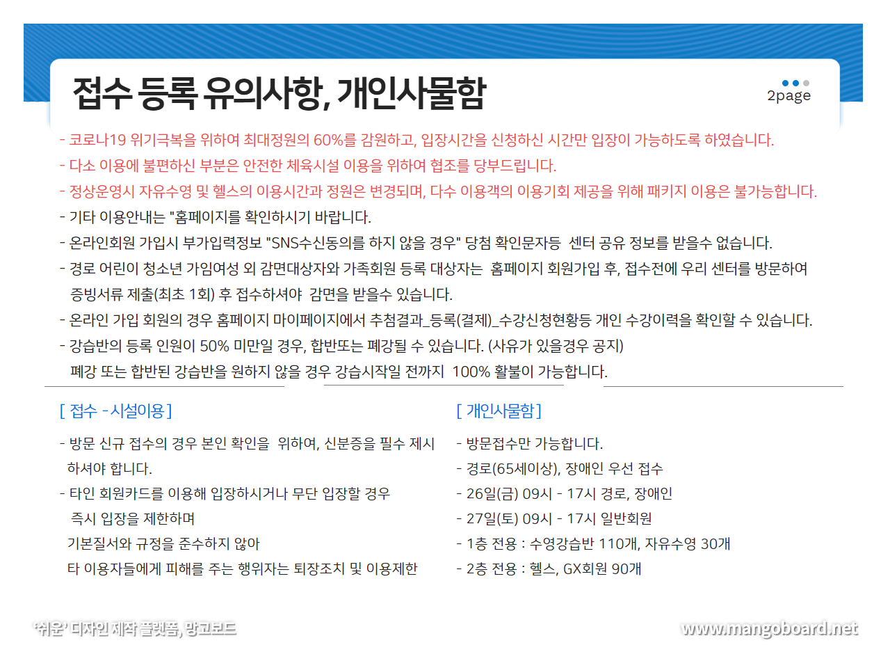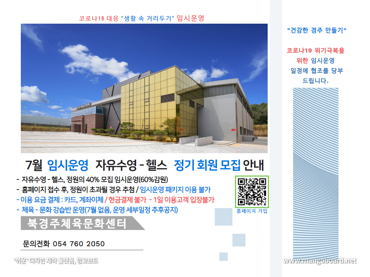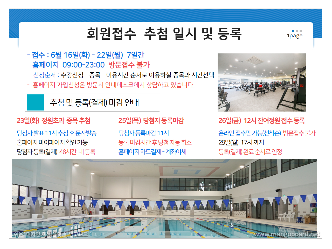 7월 임시운영 자유수영 헬스 정기 회원 모집 안내 작성자 : 관리자 조회 : 1,687 등록일시 : 2020년 6월 15일 9시 18분 57초 1.png [ Size : 943.38KB, Down : 2,590 ] 미리보기 다운로드 2.png [ Size : 1.14MB, Down : 2,510 ] 미리보기 다운로드 3.png [ Size : 191.46KB, Down : 2,444 ] 미리보기 다운로드 4.png [ Size : 328.21KB, Down : 2,452 ] 미리보기 다운로드 5.png [ Size : 1.19MB, Down : 2,414 ] 미리보기 다운로드 목록보기