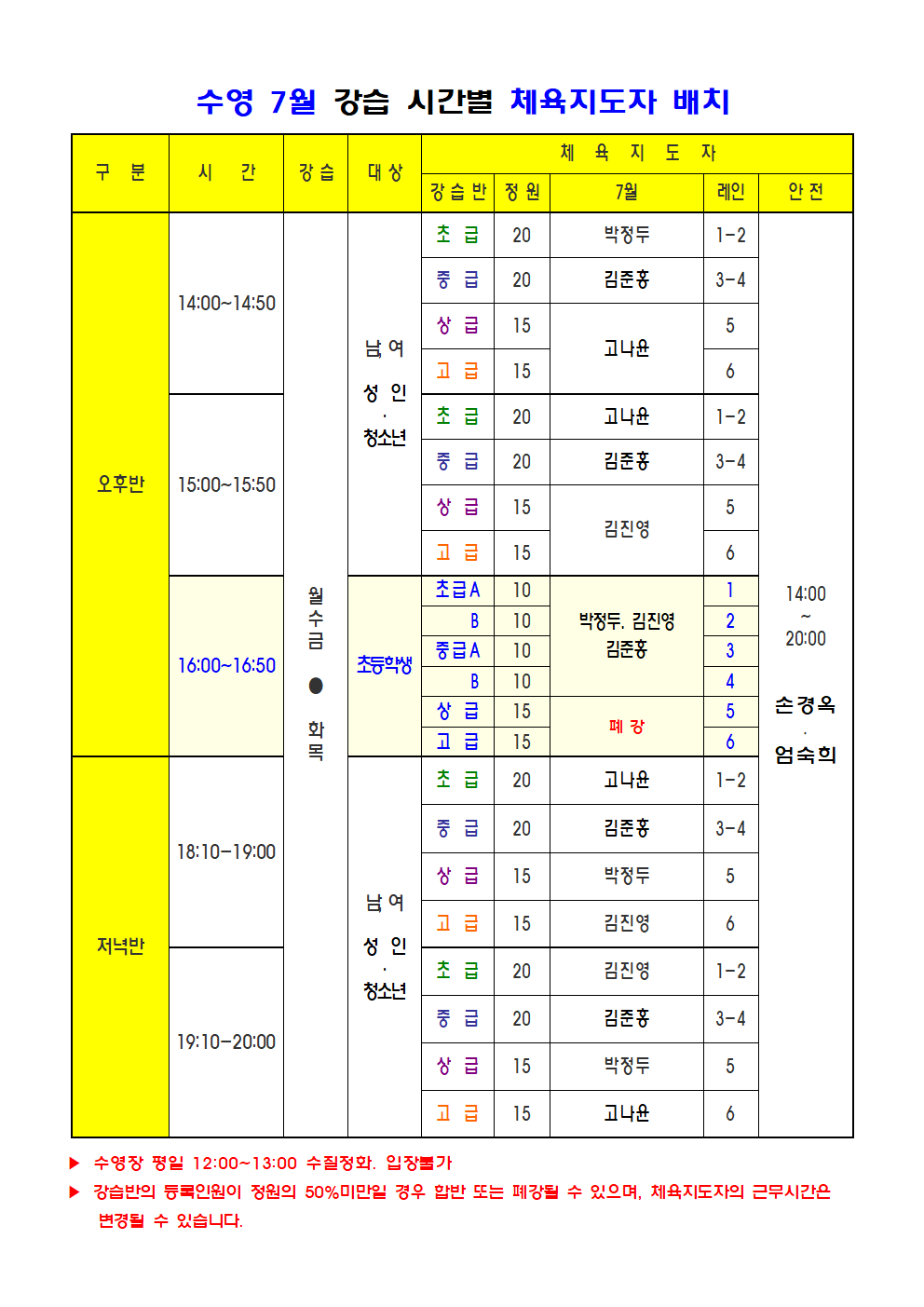 7월, 수영 강습반 합반과 체육지도자 배치 안내(07.20 수정) 작성자 : 관리자 조회 : 666 등록일시 : 2022년 6월 29일 12시 47분 0초 image001.png [ Size : 58.07KB, Down : 343 ] 미리보기 다운로드 image002.png [ Size : 70.21KB, Down : 334 ] 미리보기 다운로드 목록보기