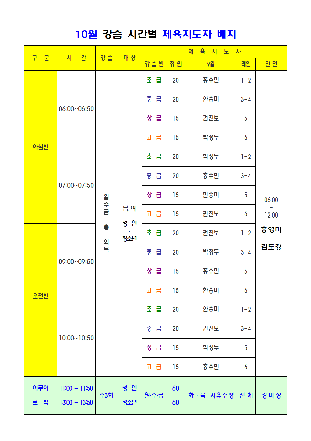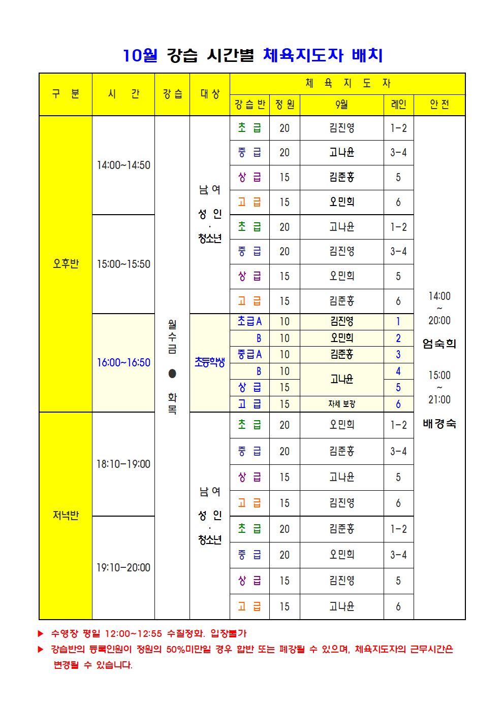 10월, 수영 강습반 체육지도자 배치 안내 작성자 : 관리자 조회 : 571 등록일시 : 2022년 9월 29일 9시 16분 49초 image003.png [ Size : 57.3KB, Down : 726 ] 미리보기 다운로드 image004.png [ Size : 71.86KB, Down : 699 ] 미리보기 다운로드 목록보기