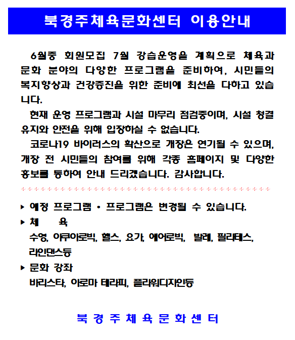 회원모집 및 개장 준비 안내 작성자 : 관리자 조회 : 885 등록일시 : 2020년 5월 13일 9시 55분 50초 팝업 01.png [ Size : 29.1KB, Down : 1,027 ] 미리보기 다운로드 목록보기