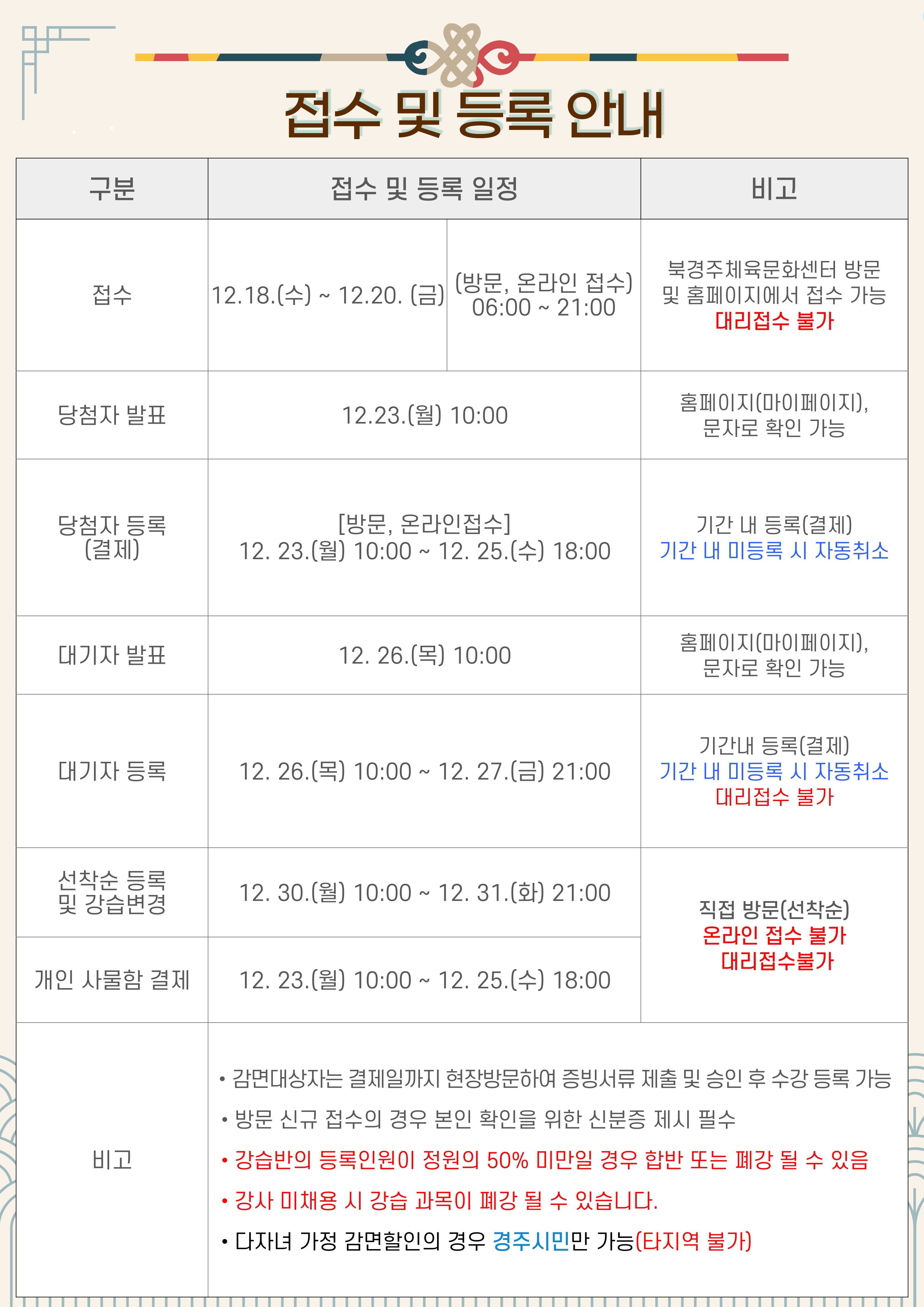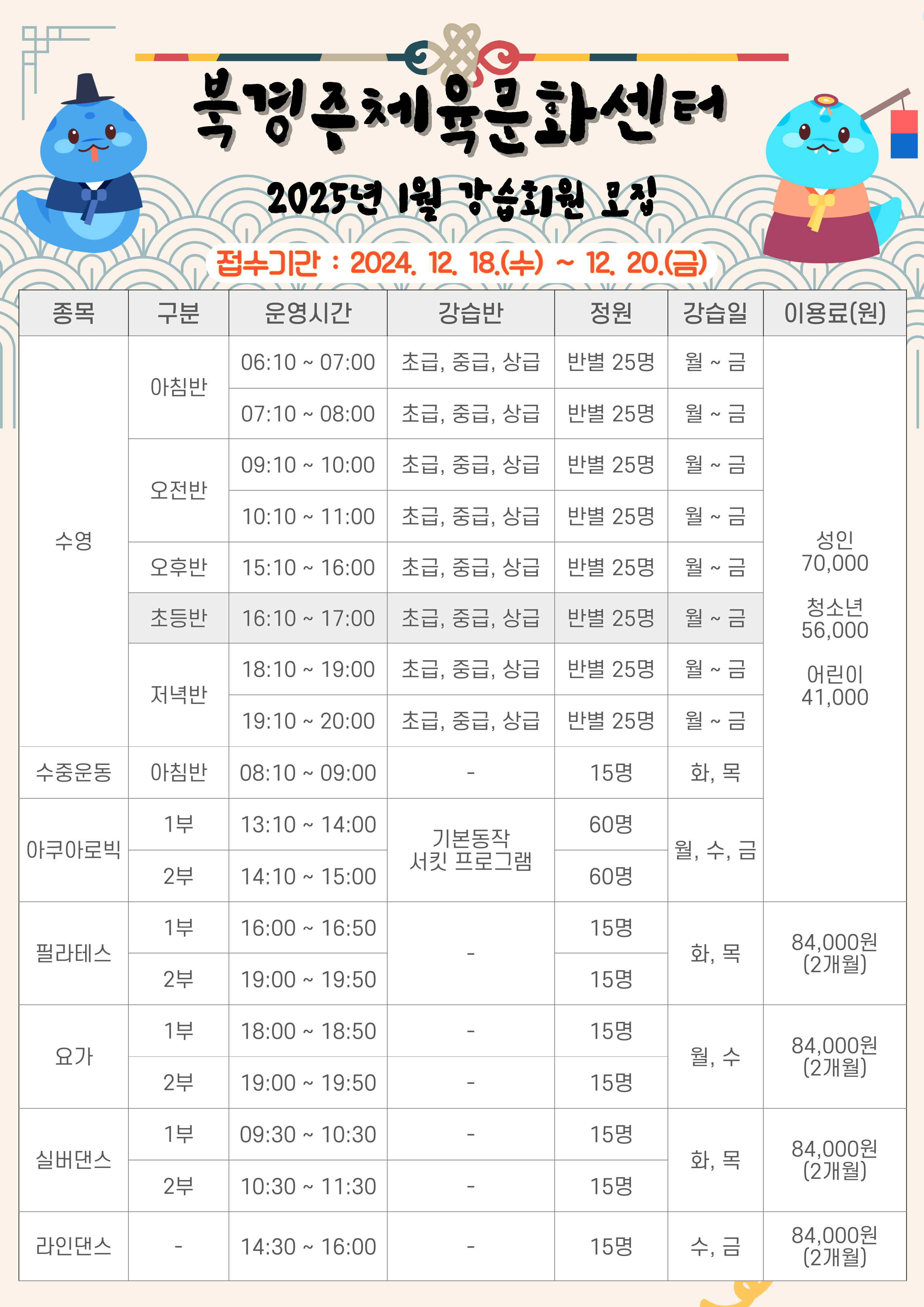 2025년 1월 강습 모집 & 접수 및 등록 안내 작성자 : 관리자 조회 : 604 등록일시 : 2024년 12월 16일 11시 23분 1초 001.png [ Size : 1.09MB, Down : 809 ] 미리보기 다운로드 002.png [ Size : 661.8KB, Down : 784 ] 미리보기 다운로드 목록보기