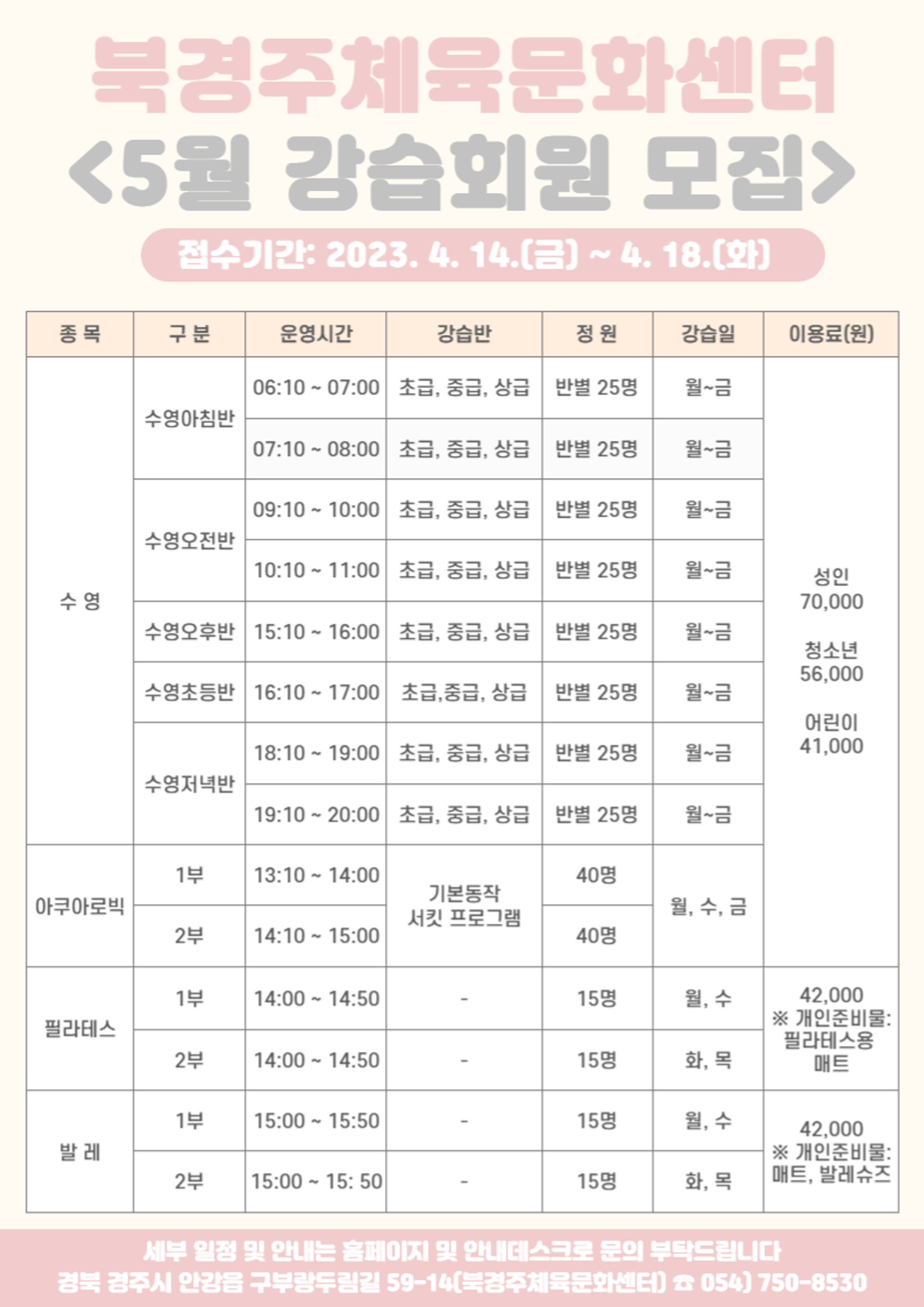 5월 정기회원 모집, 이용 안내 작성자 : 관리자 조회 : 638 등록일시 : 2023년 4월 10일 14시 37분 12초 강습회원모집(5월).png [ Size : 1.02MB, Down : 909 ] 미리보기 다운로드 접수및등록안내(5월).png [ Size : 723.22KB, Down : 898 ] 미리보기 다운로드 목록보기