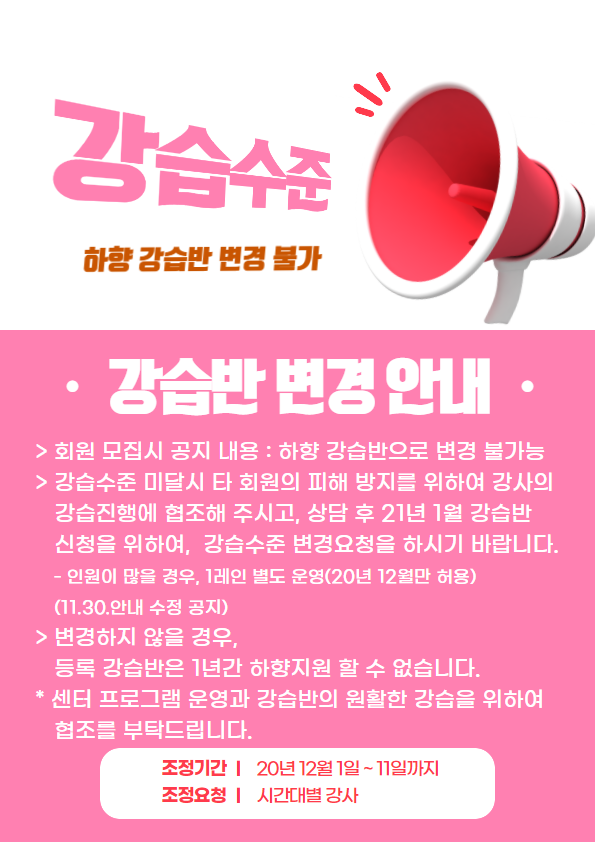 수영 수준별 강습반 이용과 변경 안내(11.30 안내 수정) 작성자 : 관리자 조회 : 599 등록일시 : 2020년 12월 2일 8시 25분 22초 강습수준 강습반 변경 (2).png [ Size : 106.34KB, Down : 509 ] 미리보기 다운로드 목록보기