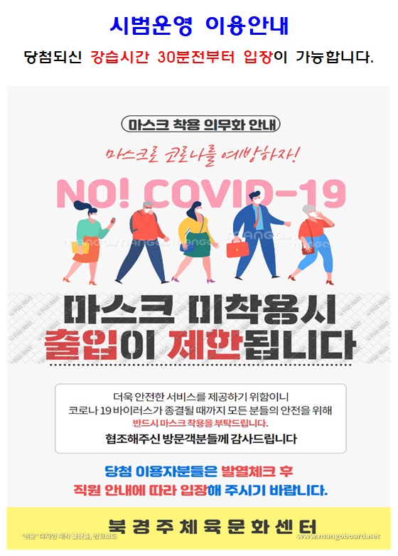 임시개장 "수영_아쿠아로빅_헬스 무료체험 이용" 입장 안내 작성자 : 관리자 조회 : 810 등록일시 : 2020년 5월 30일 17시 27분 45초 공지.png [ Size : 218.91KB, Down : 1,177 ] 미리보기 다운로드 목록보기