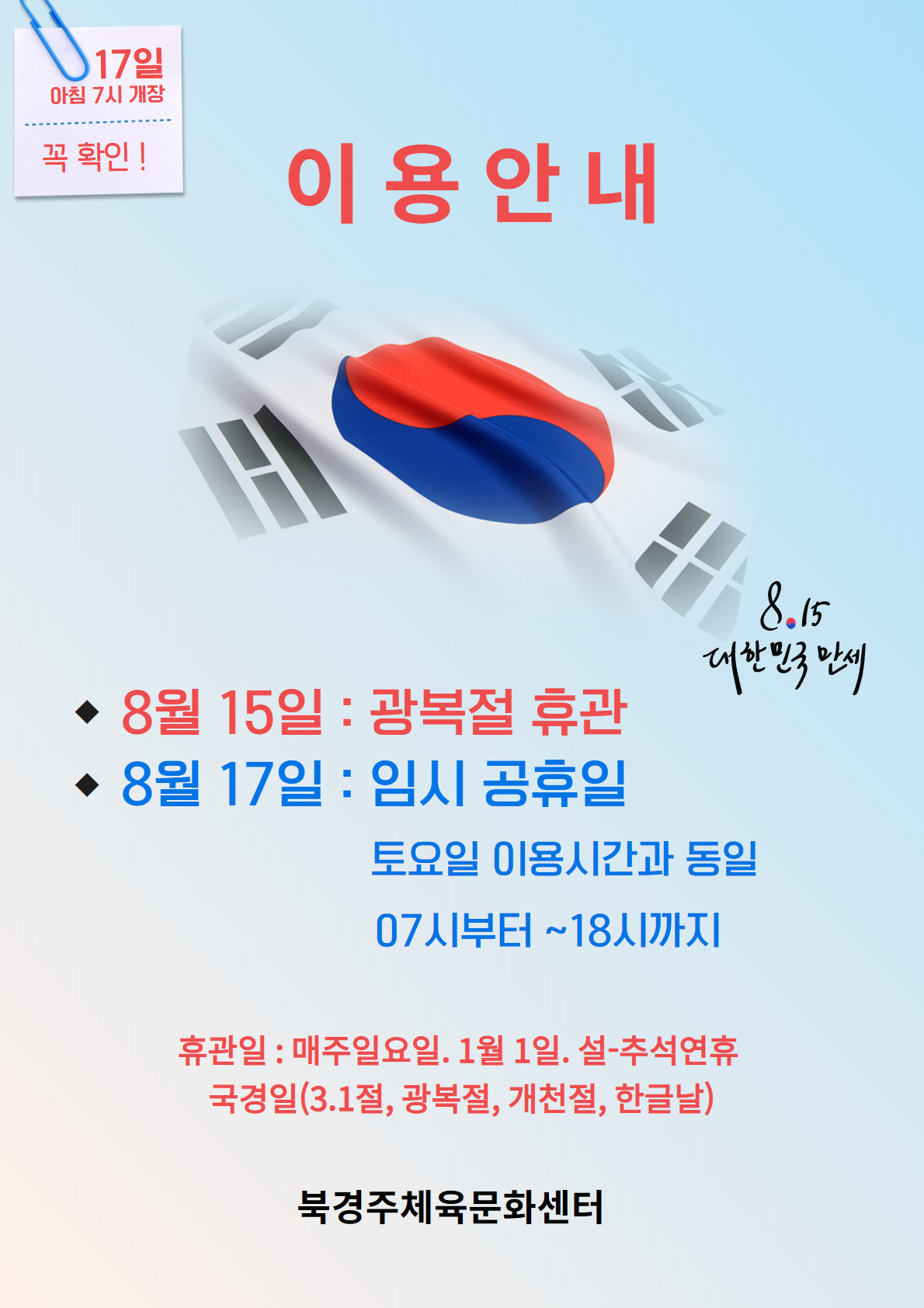 광복절 휴관 작성자 : 관리자 조회 : 0 일정 기간 : 2020년 8월 15일 0시 0분 ~ 2020년 8월 15일 23시 30분 광복절 임시공휴일 안내.jpg [ Size : 370.69KB, Down : 127 ] 미리보기 다운로드 광복절 휴관 목록보기